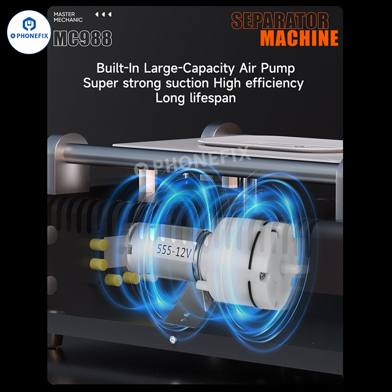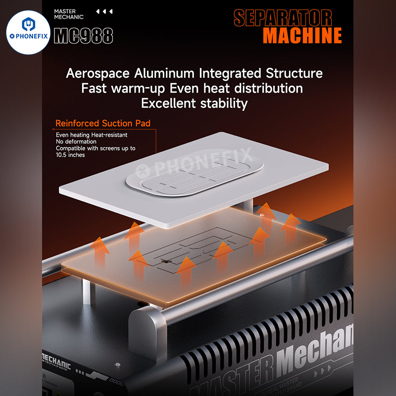 Mechanic MC988 150W LCD Screen Separator built-in Air Pump for mobile phone/tablet screens removal up to 10.5 inches. Smart control panel, strong suction, rapid preheating, uniform heating/dissipation, heat-resistant, no deformation. Suitable for separating screens of mobile phones, iPhones, iPads, tablets, etc.