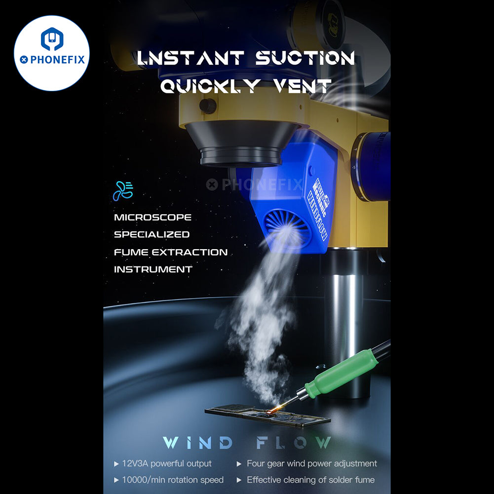 Mechanic WindFlow X Smoking Fan Microscope Ring Light 2 In 1 Instrumenet. MECHANIC WindFlow Microscope Fume Extraction Instrument effectively absorbs soldering fumes smoke to clean the air and protect health. Powerful microscope fume extractor fan has exquisite workmanship, which uses high energy fans to extract dust, toxic fumes and other harmful particles into a contained filtration system.