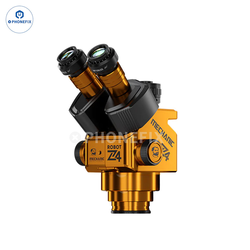 MECHANIC ROBOT Z4 Trinocular Stereo Microscope with 6.5X-60X Magnification and WF10X/25 Adjustable Eyepiece for Mobile Phone Motherboard Soldering Repair. 6.5X-60X/1:9.2 high zoom ratio provides extremely clear images, and using the HD camera with a CTV 0.45X adapter provides ultra-2K/4K video, which is suitable for mobile phone, laptop and electronics repair.