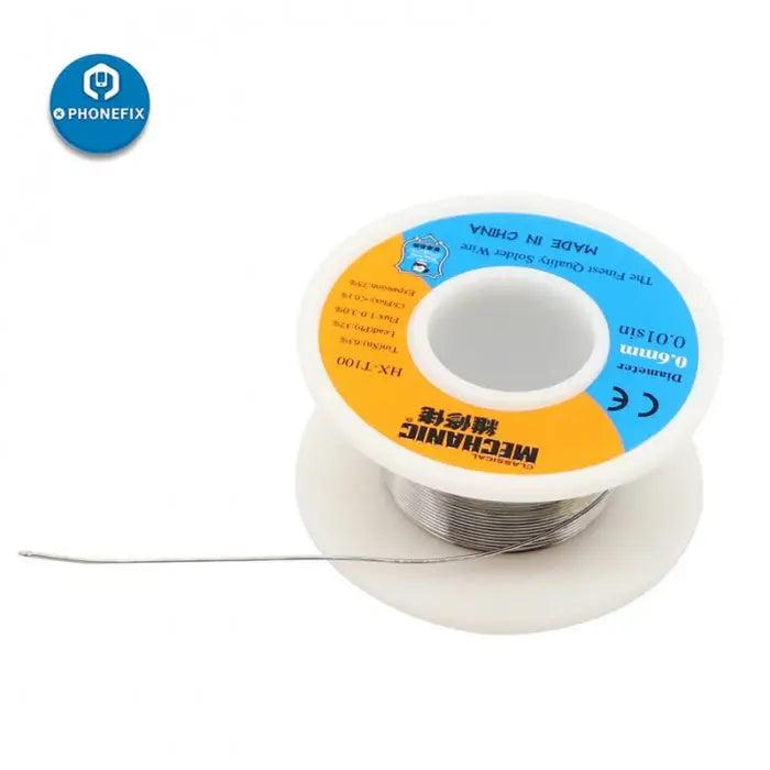 MECHANIC HX-T100 55G fine Solder Wire 183℃ Pb37% Sn63% Tin Content High Purity Tin Wire for Mobile Phone Repair. Good solderability, insulation resistance, no spatter and no corrosion, low melting point and high brightness solder joint. Suitable for mobile phone motherboard BGA chips repair and electronics circuit board soldering repair.