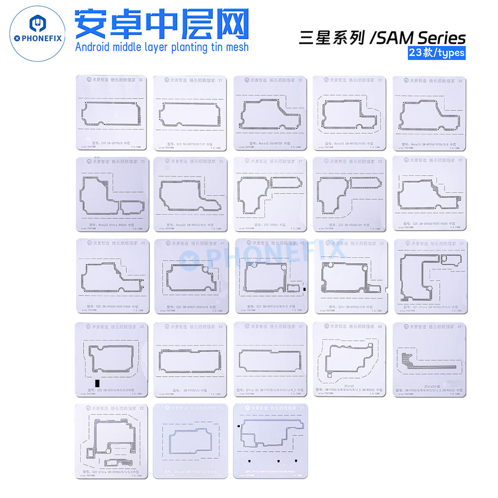MiJing M21 universal magnetic base mobile phone motherboard middle layer frame reballing platform. MiJing universal magnetic base with magnetic middle layer steel mesh stencil and scraper blade tin paste knife for cell phone logic board middle layer mid frame BGA Tin planting repair. Mijing GX01 GX02 Non-magnetic tin paste scraper knife set for motherboard IC glue removing tin-planting.Features: 1. Temperature resistance and strong magnetism. 2. Temperature-resistant silicone material, built-in strong magnetism. 3. Suitable for mobile phone motherboard middle layer, middle layer mania, BGA, tin-planting, ect.Mijing Middle layer reballing stencil: 1. For Samsung middle layer reballing stencil 23pcs: SAM-S10 5G SAM-S10 5G_x005fG977U/R/T/P SAM-NOTE10 5G-N975F SAM-NOTE10 SM-N970U/9700 SAM-NOTE 10 SM-N976V/975U/0/8 SAM-Note20 U1tra N9860 SAM-Note20 SM-N981U/N/0 SAM-S20 G988U SAM-S20 SMG988B/BR SAM-SM_x005fG986B/985F/986B SAM-S20 SMG986B/985F/986N SAM-S20 SM_x005fG980F/G981B/N SAM-SM_x005fG991U/O/W/D-S SAM-S21+ SM-G996U/O/W SAM-NOTE 10 SM-N976V/975U/0/8 SAM-S22 SM-S901U/W/O/D/E SAM-SM_x005fF700F/U SAM-ZF1ip 5G SM-F707B/U/N/O/U1/J/W_S SAM-ZFo1d3 SM-F926/U/W/ B/N/O/D/J_S,SM-W2022 SAM-ZFo1d3 SM-F926/U/W/ B/N/O/D/J_S,SM-W2022 SAM-S22 Ultra SM-S908U/ W/O/D/E" SAM-ZFold4 SM-F936U-SU/W SAM-F721U/B/N/O/D/W/BE/W70232. For Huawei middle layer reballing stencil 33pcs: HW-Mate RS HW-Mate 40RS Camera board HW-Mate 40RS RF small board HW-P30Pro HW-V30Pro HW-P40Pro HW-P40Pro+ HW-P40Pro Front MIC small board HW-honor30Pro HW-P50 Display small board HW-P40Pro HW-P40Pro+ HW-P40Pro Front MIC small board HW-honor 30Pro HW-P50 Display small board HW-Mate X2 HW-P50 Pocket HW-P50Pro HW-P50Pro Qualcomm Edition HW-honorMagic3 HW-Honor Magic 3 phase head small board HW-Honor Magic3Pro RF/Small Phase Head Small Board HW-Honor Magic3 Ultimate Edition HW-Honor Magic3 Ultimate RF Small Board HW-honorMagic 4Pro HW-Honor Magic 4 shows small boards HW-Nov6 4G small board HW-honorV30 5G HW-p60pro HW-Mate50Pro/RS HW-Mate50Pro/RS HW-p60Pro board HW-p60Pro board3. For Xiaomi middle layer reballing stencil 12pcs: XIAO MI-9 Pro XIAO MI-10U XIAO MI-11U1tra/11Pro XIAO MI-11 Pro Battery holder XIAO MI-12S U1tra XIAO MI-MIX 4 XIAO MI-12S U1tra XIAO MI-12X IAO MI-12S XIAO MI-12Pro XIAO MI-12Pro Xiao MI -12S Pro4. For VIVO middle layer reballing stencil 4pcs: VIVO-X60 Pro VIVO-X70 Pro+ VIVO-X50 Pro+ VIVO-X80 Pro5. For Oppo middle layer reballing stencil 7pcs: OPPO Find-X3 Pro OPPO Find-X2 OPPO Find-Pro OPPO Find-N OPPO Find-X5 OPPO Find-X5 Pro OPPO Ace-5G6. For IQOO middle layer reballing stencil 10pcs: IQOO/3 5G IQOO/Pro IQOO/5 Pro IQOO/5 IQOO/7 IQOO/8 IQOO/8 Pro IQOO/9 IQOO/9Pro IQOO/10Pro7: For Sony middle layer reballing stencil 3pcs: SONY/Xperia1 11 x1ii SONY/Xperia 511 SONY/Xperia 1 III8: For ASUS middle layer reballing stencil 3pcs: ASUS/ZenFone8 ASUS/ZenFone9 ASUS ROG69. For One Plus middle layer reballing stencil 2pcs: One Plus/1+9Pro One Plus/10Pro