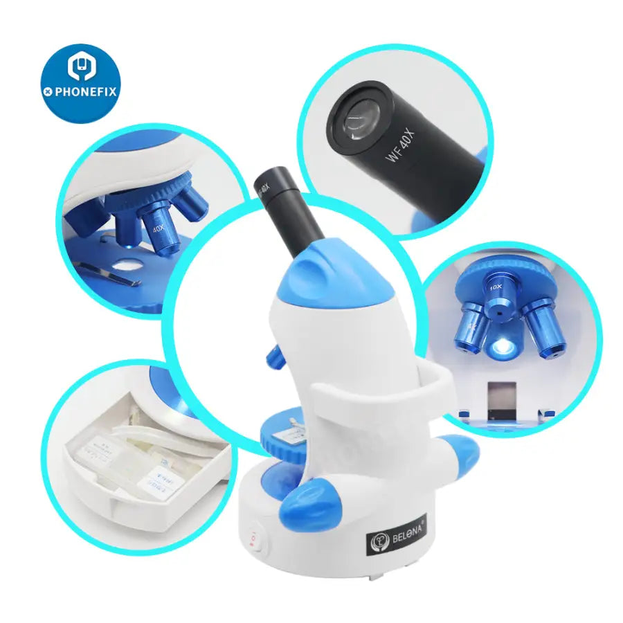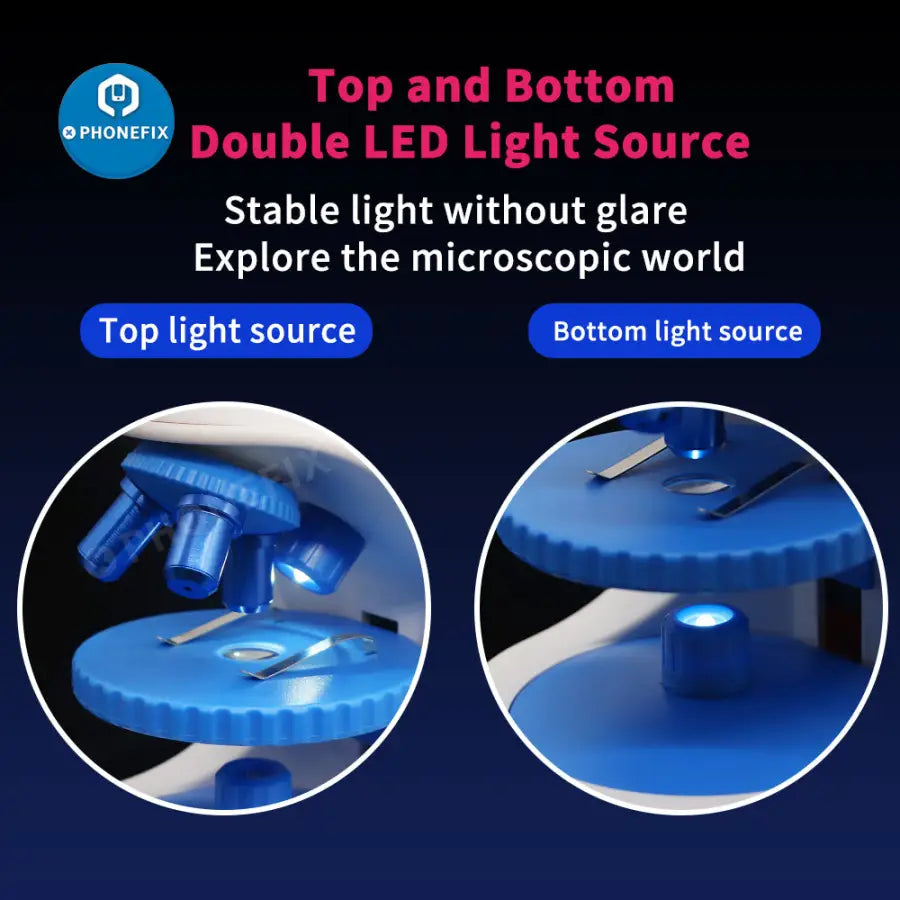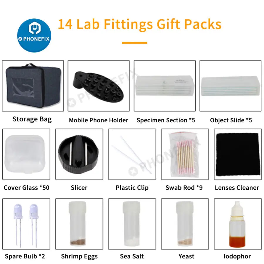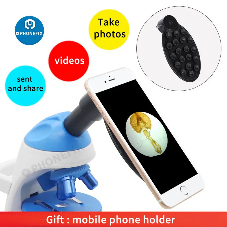 Monocular Biological Microscope 1600X HD Optical Microscope with Top Bottom Lamp Laboratory Microscope for Primary and Middle School Student Children Home Science Education, with Phone Holder, Handbag, 12Pcs Lab Gift Packs.