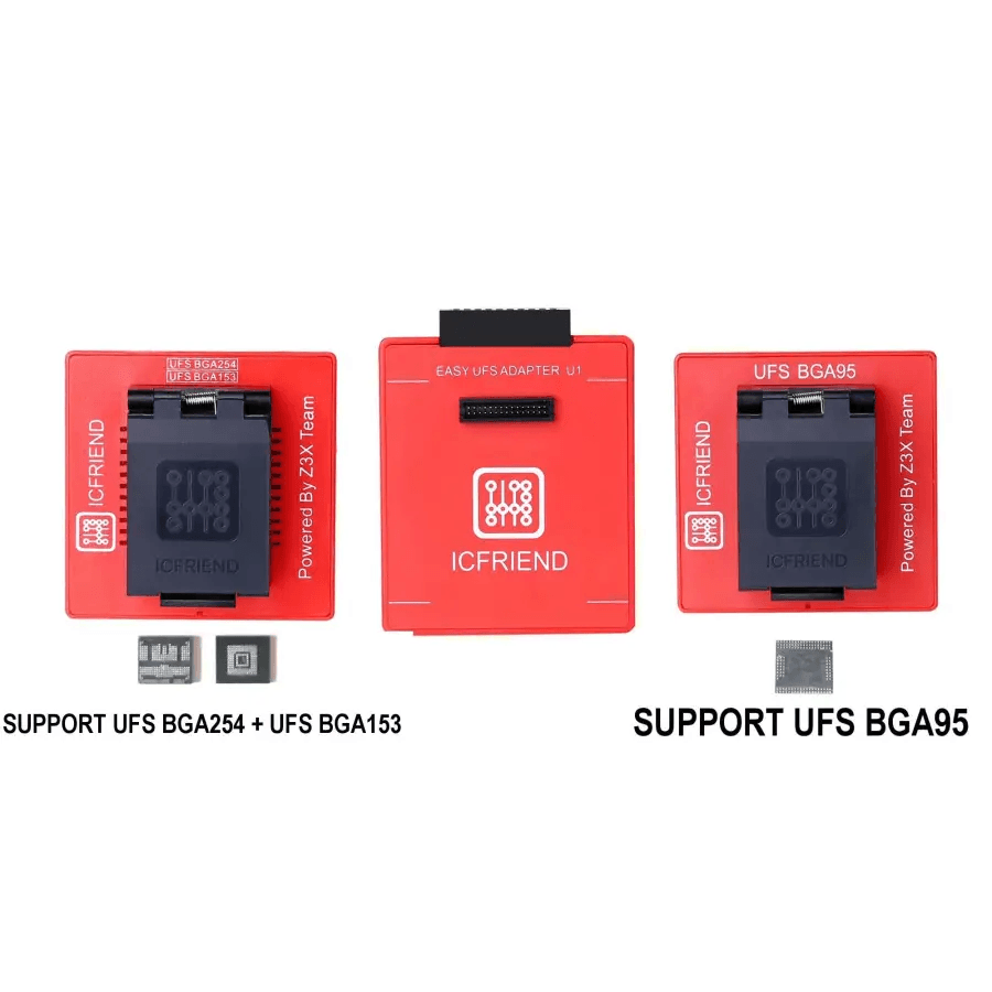 ICFRIEND E-MATE X EMMC BGA 13-IN-1 Adapter with ICFRIEND UFS chip reader socket(UFS BGA95/UFS BGA153/UFS BGA254). E-Mate X EMMC 13-in-1 Adapter is designated for direct EMMC memory chips connection with the wide range of supported BGA types. ICFRIEND 3 in 1 UFS Chip Reader Set is intended for Z3X Easy JTAG Plus Box and allows you to read/write data on the newest UFS chipsets. 3 IN 1 UFS Chip adapter +13 IN 1 E-MATE X EMMC BGA adapter for Easy Jtag Plus Box and UFI BOX.