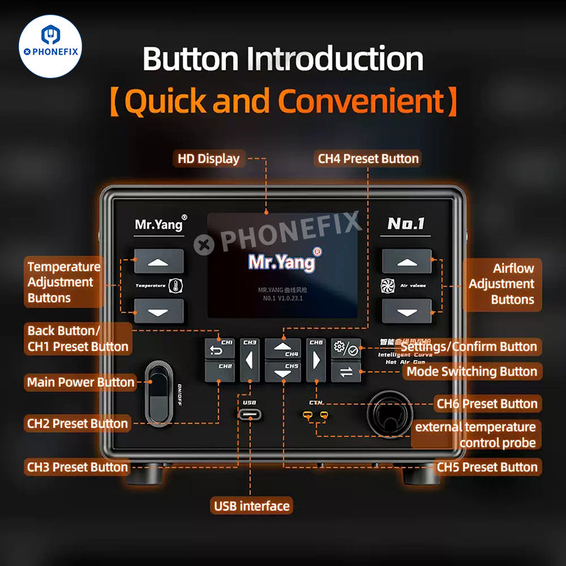 YCS Tool - Mr.Yang No.1 1400W Hot Air Rework Station Heat Gun with digital display curve mode, large chip mode and small chip mode for mobile phone motherboard CPU BGA chip welding desoldering repair. Fast heating, accurate temperature control, auto sensing and smart sleep mode.