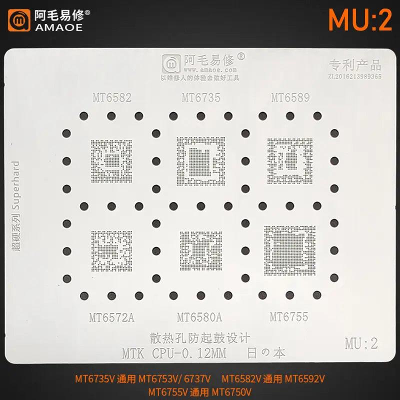 Amaoe BGA Reballing Stencil MU1 MU2 MU3 MU4 tin planting steel mesh for Android MTK CPU Series MT6795 MT6582 MT6762 MT6873V MT6765V. Multi-purpose 0.12MM BGA reballing stencils template for cellphone CPU motherboard repair tool.