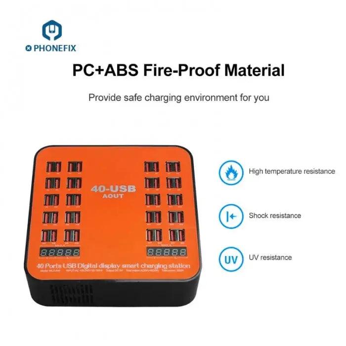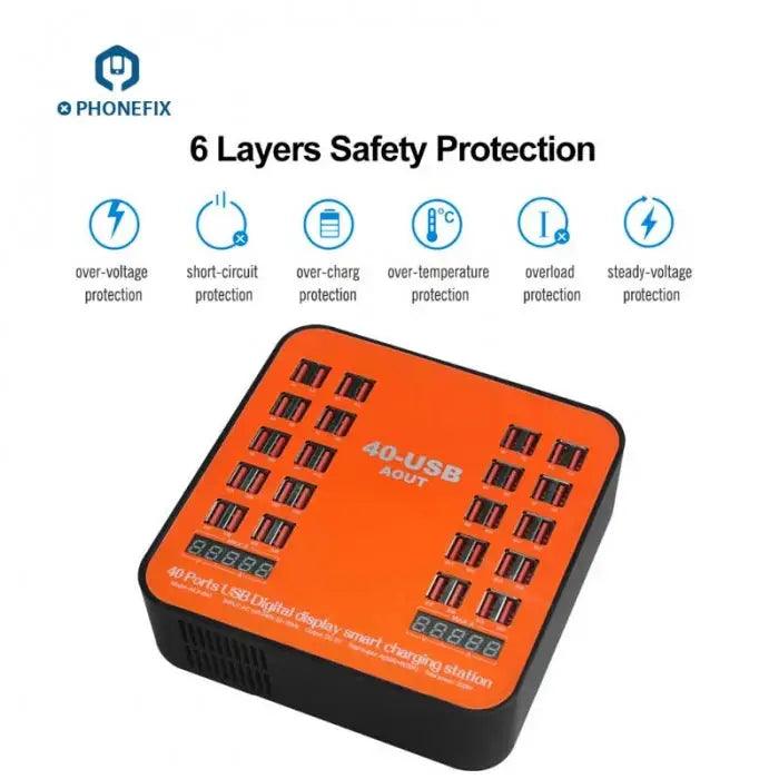 5V 40 Ports USB Charging Station With LED Display, USB Hub charging Station For iPhone 8 7 6 6s Plus and Samsung Mobile Phone devices.