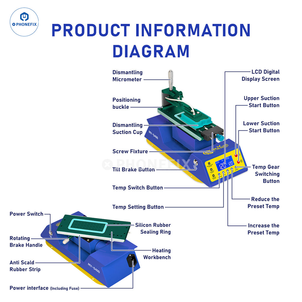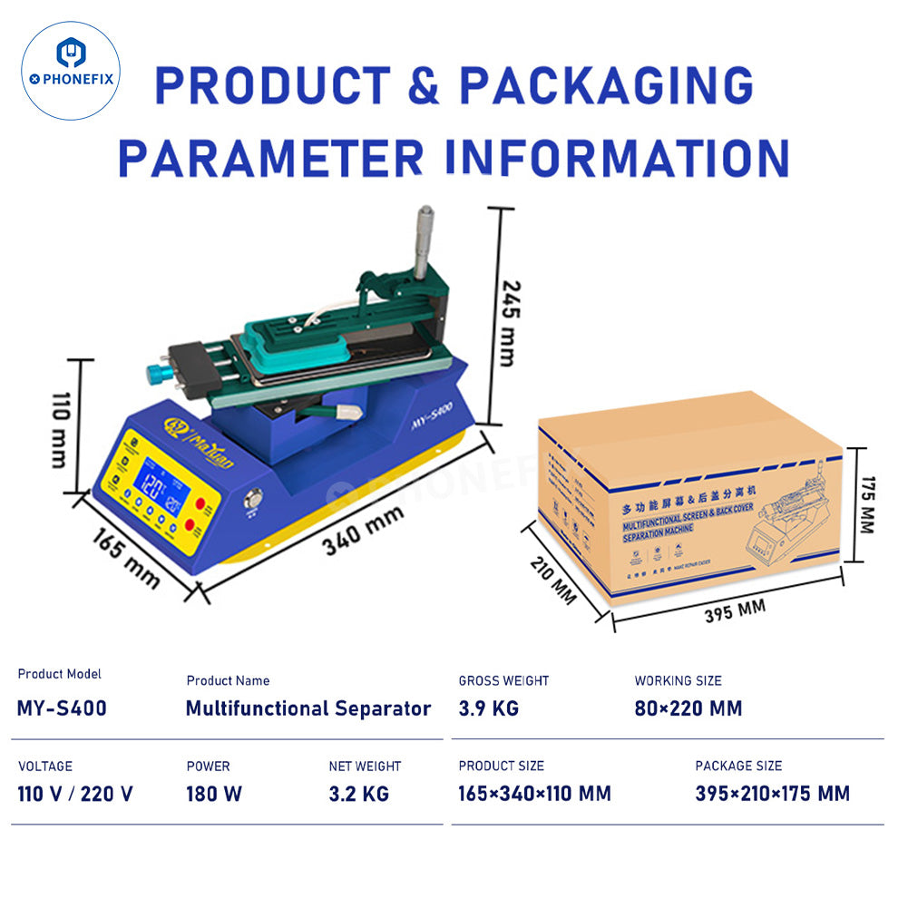 MaYuan MY-S400 Multifunctional LCD Heating Separator with 360-degree rotating platform and powerful suction cups, built-in double vacuum pumps, uniform and stable temperature distribution, suitable for mobile phone screen heating, screen frame removal, screen separation, glue removal, etc. LCD display, temperature memory, silent design, easy operation.