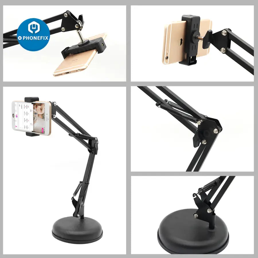 Included: 1 X Articulating Suspension Scissor Arm 1 X Cell Phone Holder 1 X Round Base (Cell Phone Not Included)