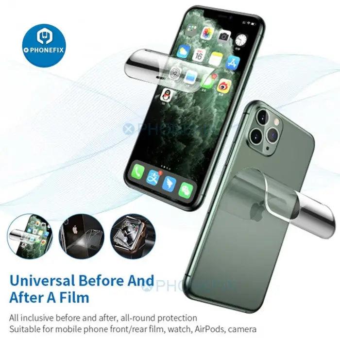 Product Features: 1. Principle of non-curved edge 2. Cobweb structure / Lifting explosion-proof 3. Durable and reinforced 4. Lossless color / Bare metal texture, as thin as 0.1mm 5. Strong anti-fingerprint / Dewatering and oleophobic. 6. Automatic repair of minor scratches within 24 hours 7. Suitable For Mobile phone front / rear film, watch, AirPods, camera.