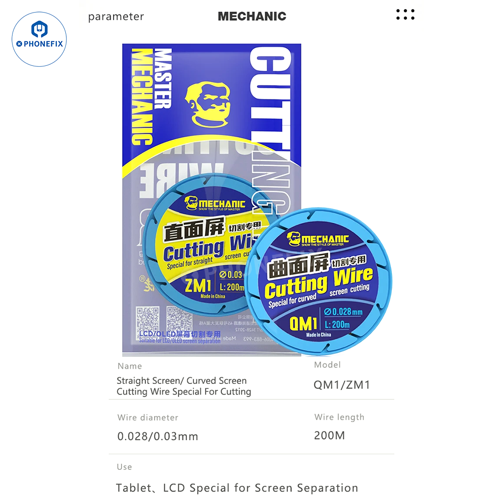 Mechanic QM1/ZM1 Cutting Wire is suitable for cutting straight curved screens. It adopts Imported Nano technology and fixed wire design, high carbon steel alloy rubber ring edge and can be used for separating curved screens such as Samsung/Huawei/Xiaomi. Mechanic LCDO8 Cutting Wire adopts Super nano materials, ripple linear processing special for tablet PC/LCD screen.