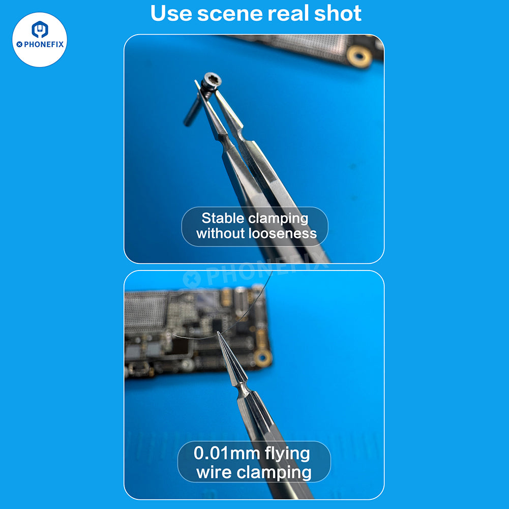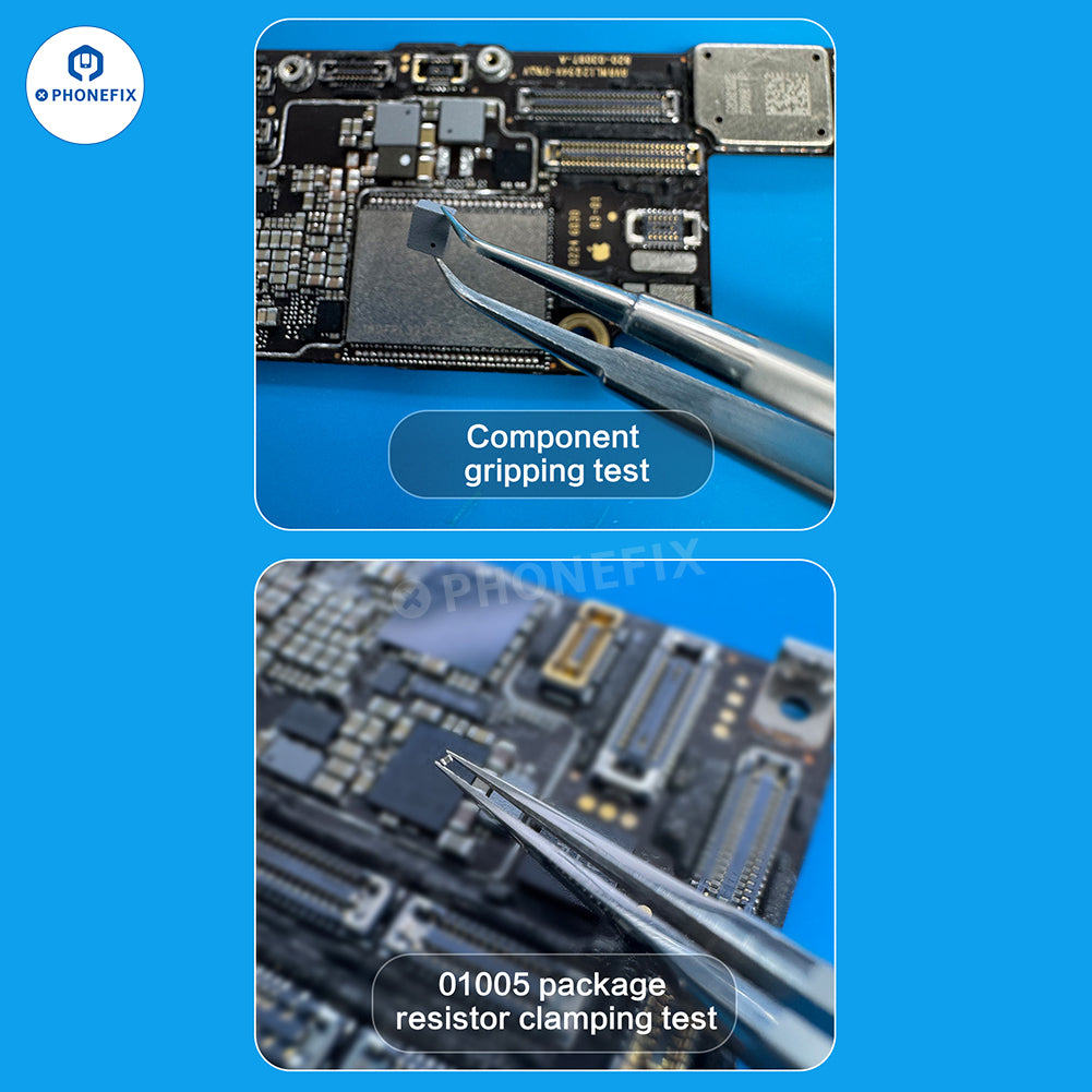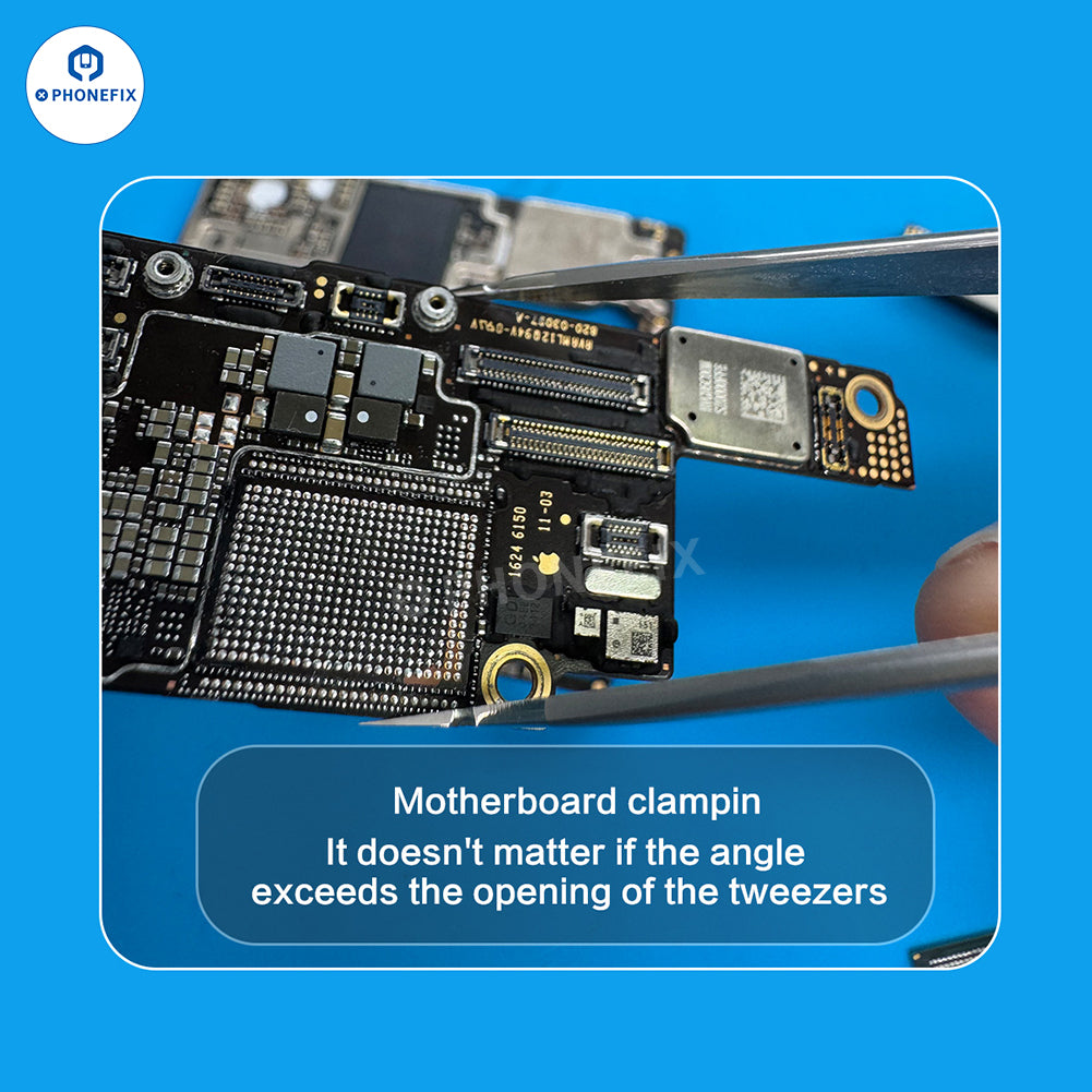 PHONEFIX i2C NS-01 NS-02 NS-03 NS-04 Super Alloy Precision Tweezers for gripping small parts and soldering and repair work in the narrow gap space of the mobile phone motherboard, etc. DIYPHONE 2.5D 3D Tweezers pointed curved tip for mobile phone and tablet repair, such as CPU IC components gripping, jumper wire welding, etc.