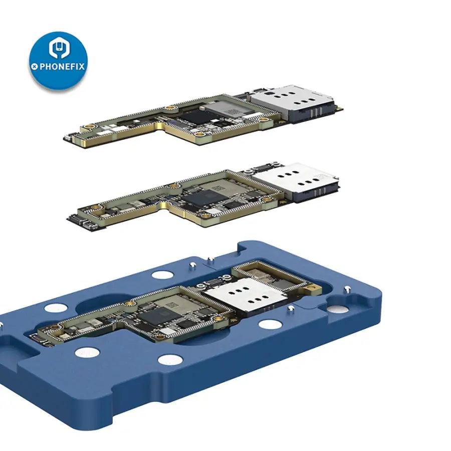 QianLi motherboard middle frame reballing platform with BGA stencil for iPhone X-17 Pro Max. Qianli middle layer reballing fixture for iPhone X/11/12/13/14/15/16/17 Pro Max motherboard repair. Qianli iPhone X-17 series middle frame tinning station with BGA stencil for iPhone motherboard layering and bonding.