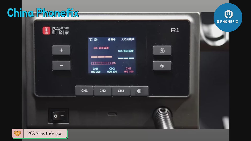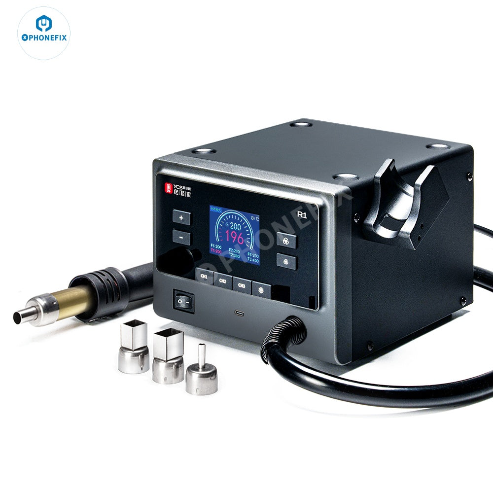 YCS R1 Smart Hot Air Gun 1000W High Power BGA Soldering Rework Station for Mobile Phone PCB Chip Repair. YCS R1 Pro 1000W Intelligent Hot Air Gun BGA Soldering Rework Station with 4 Nozzles For Mobile Phone CPU BGA Chip SMT Welding Repair. The YCS R1 hot air gun is equipped with 4 nozzles and can be used for soldering and desoldering BGA SMD chips of various electronic products, such as iPhone, iPad, mobile phones, tablets, laptops, etc.