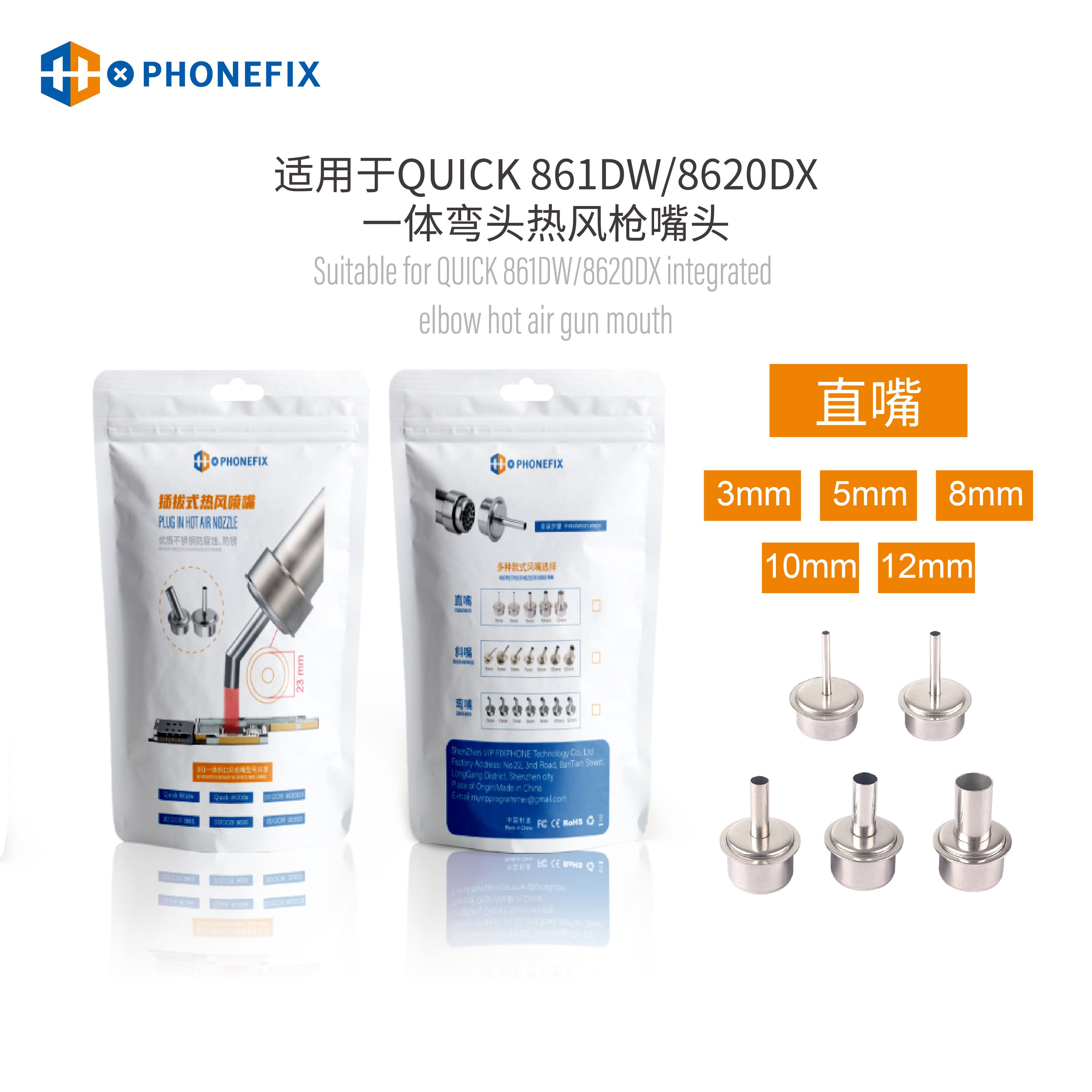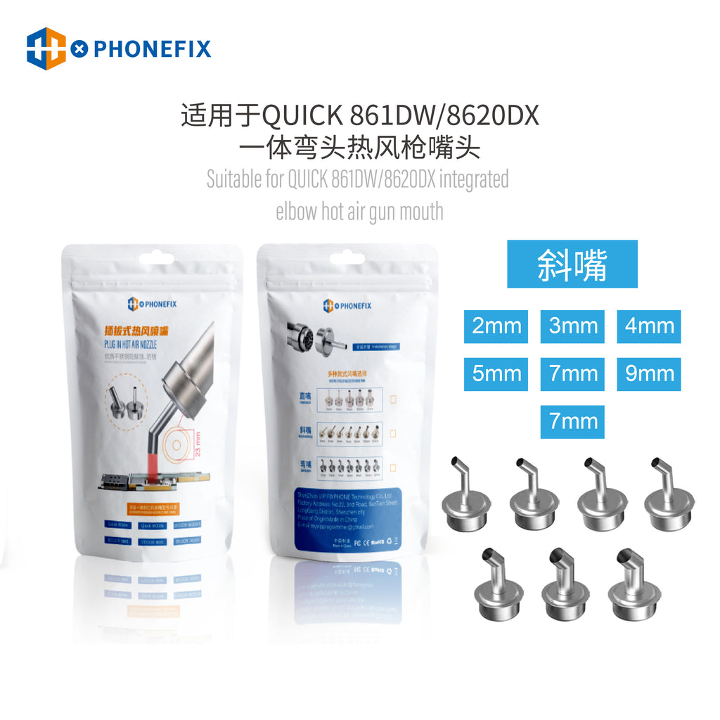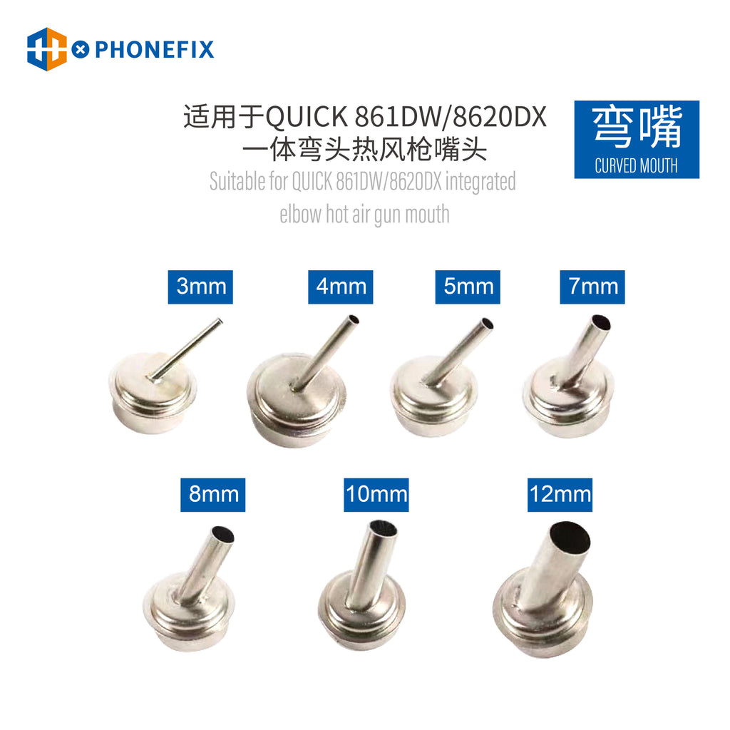 6 kinds Hot Air Gun Resisting Nozzles for Quick 861dw Rework Station, Silver Top quality 861dw Heat Gun Resisting Nozzles, 45 Degree Curved Angle Nozzle Sleeve for QUICK 861DW TR1300A Hot Air Station. OEM 861DW Hot Air Rework Station Resisting Nozzles 2/4/6/8 45 Degree Nozzle Sleeve.