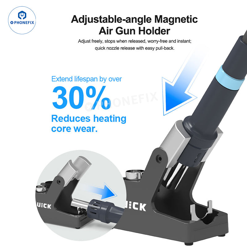 QUICK M7 1000W Intelligent Lead-free Hot Air Desoldering Station with Nozzles and Adjustable-angle Air Gun Holder for Mobile Phone Repair. 1000w high power, rapid heating and power desoldering, intelligent precise temperature control, 9-channel desoldering with 3 heating modes for small chip, BGA large chip and curve heating. Suitable for mobile phone repair, tablet repair, laptop repair, etc., compatible with various electronic circuit board desoldering and soldering needs.