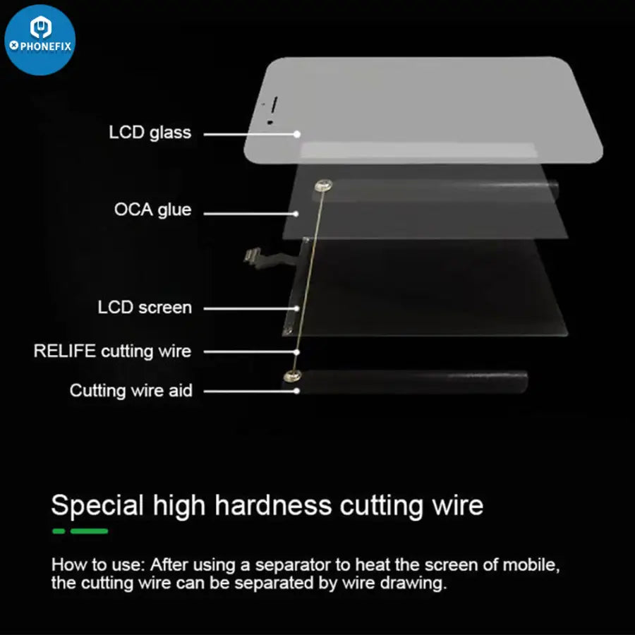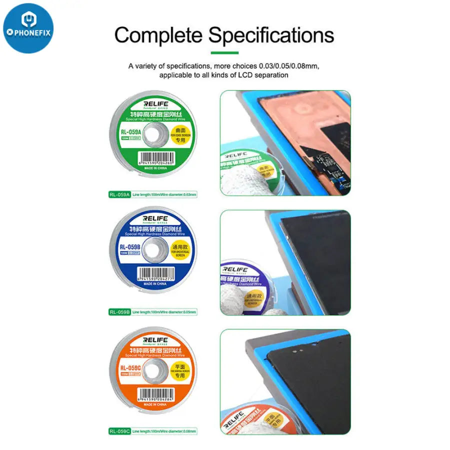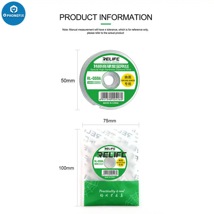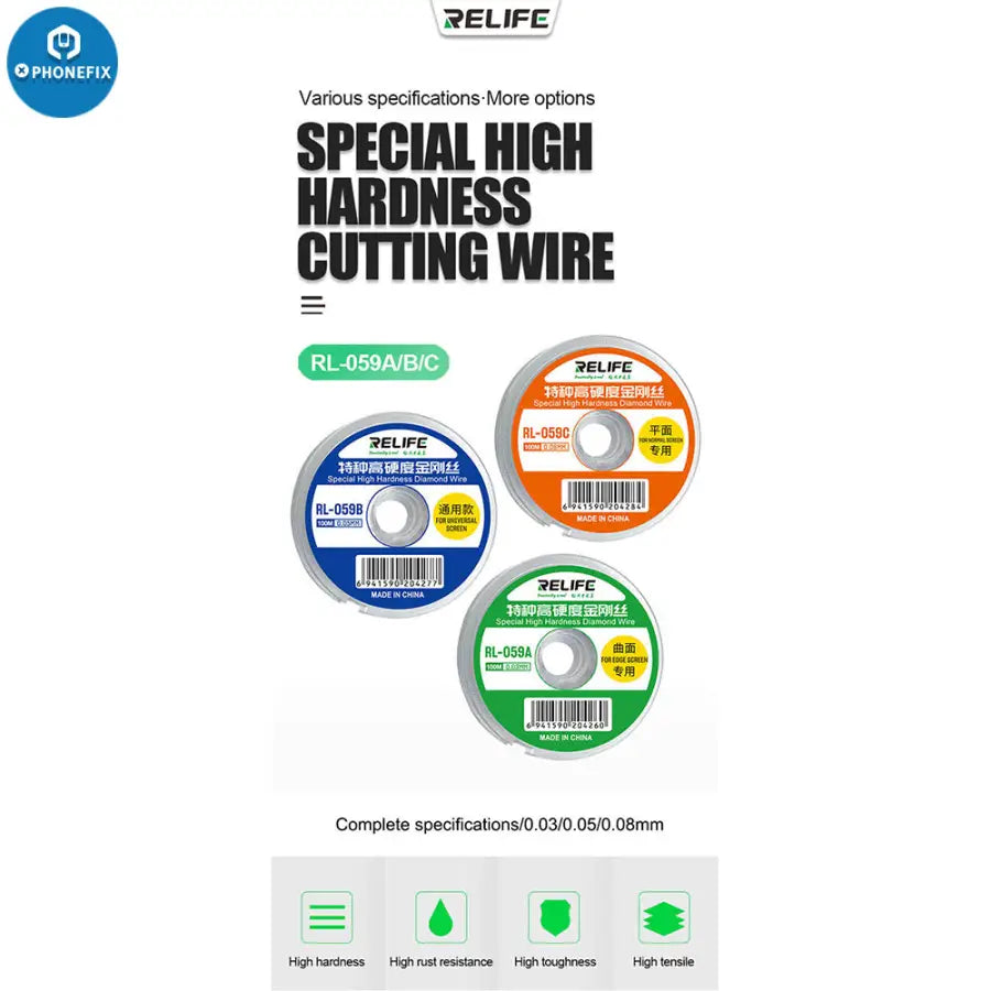 RELIFE RL-059A/B/C Ultrafine 0.03Mm Cutting Stainless Alloy Gold Molybdenum Wire for Edge Screen Separation. RELIFE High Hardness Special Diamond Wire Cutting Molybdenum Wire 0.03 0.08mm For Mobile Phone LCD Screen Separation Line.