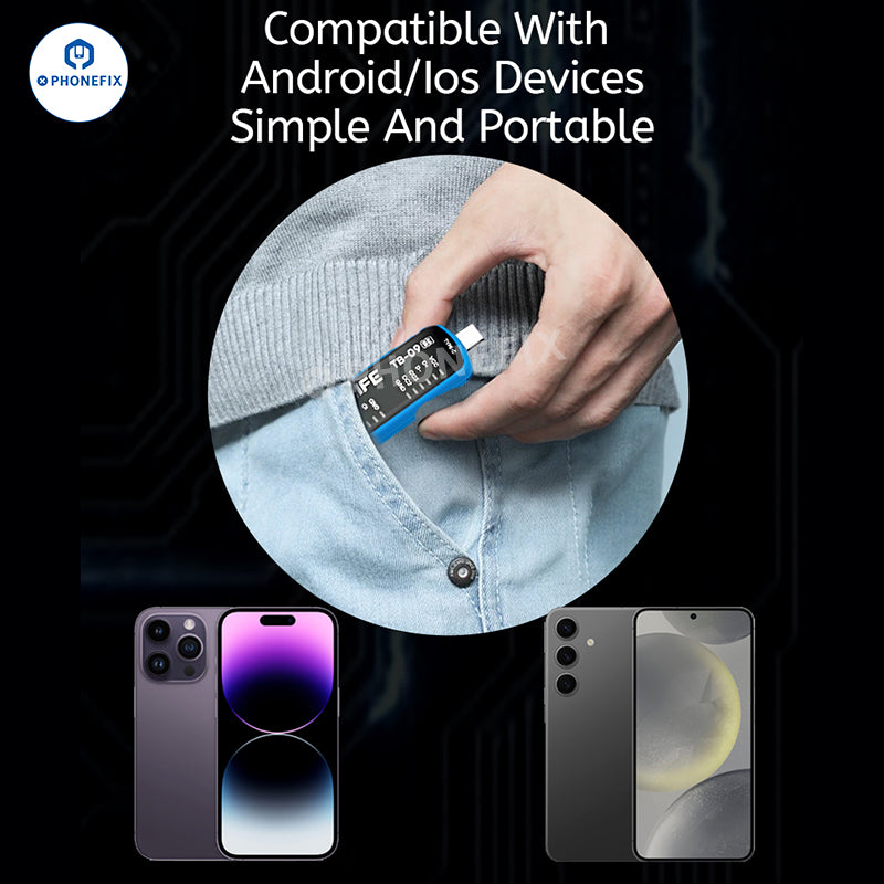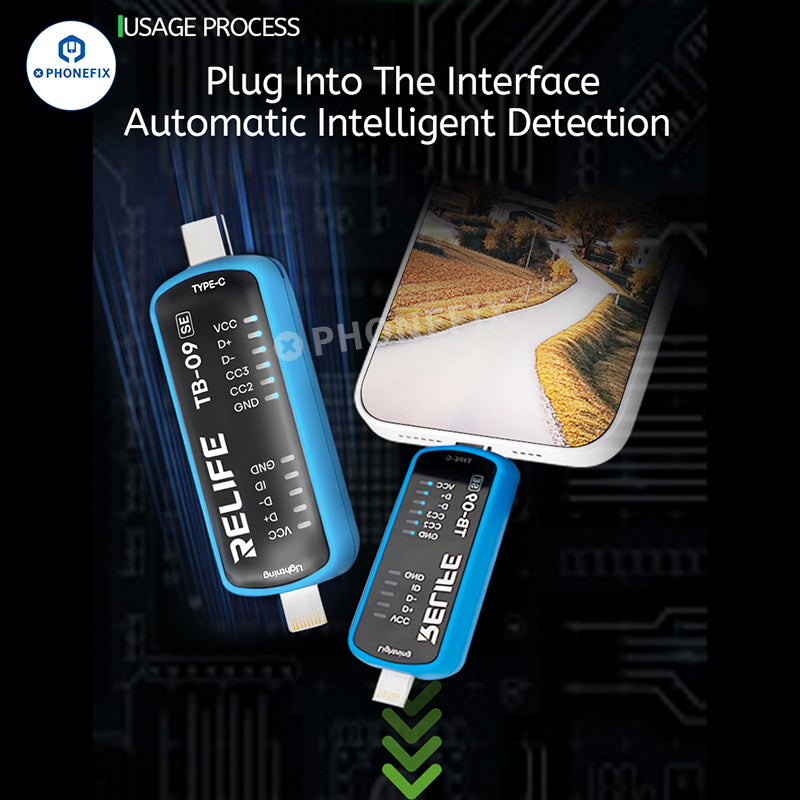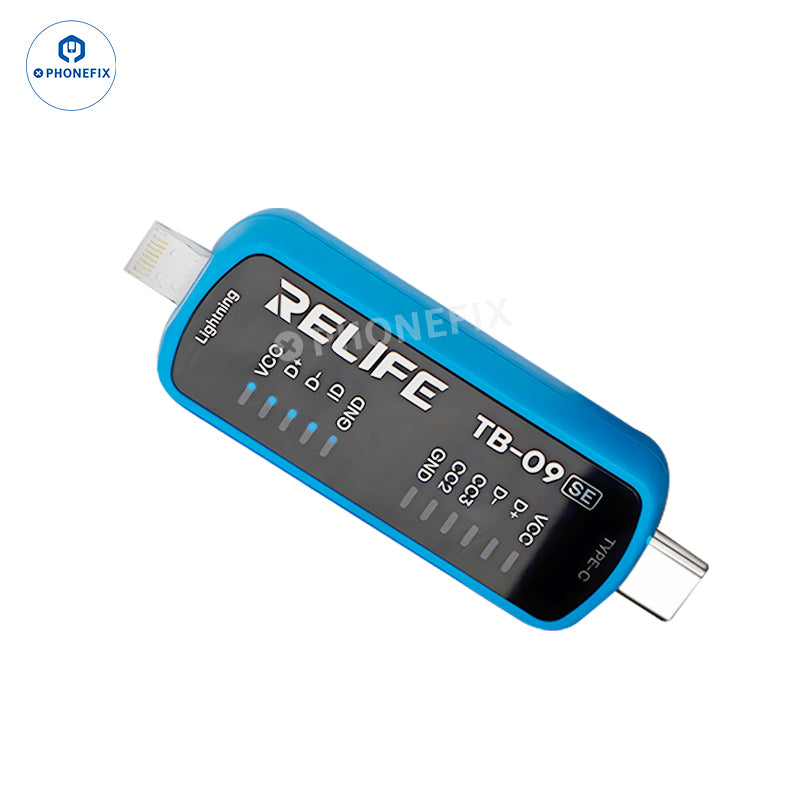 RELIFE TB-09/TB-09 SE charging port tester with Type-C lightning dual ports are suitable for testing the charging ports of most mobile phones, such as Apple iPhone, Huawei, Samsung, Xiaomi, and other Android phones. Intelligent automatic detection, fast and automatic location of charging fault points, no need to disassemble and test, compatible with Android/iOS devices, convenient and fast maintenance.