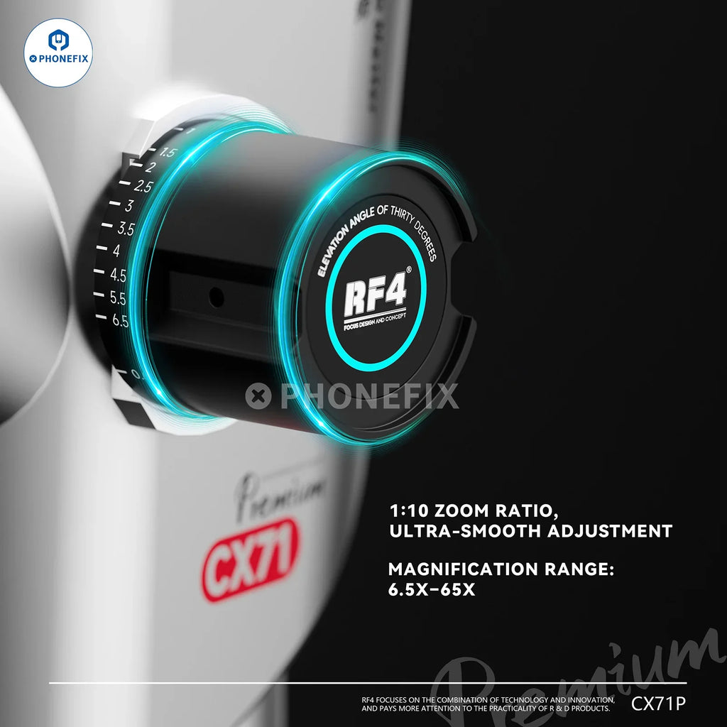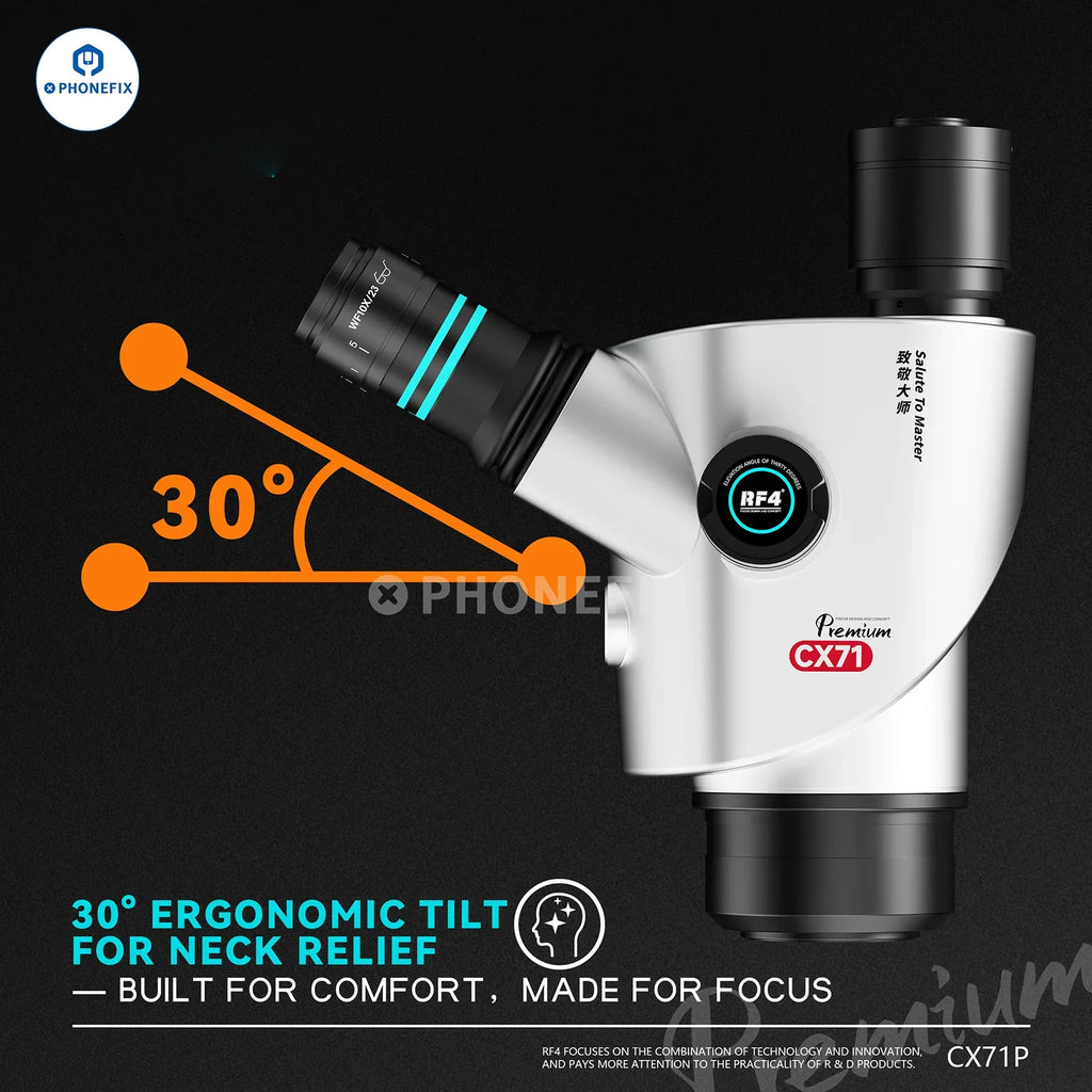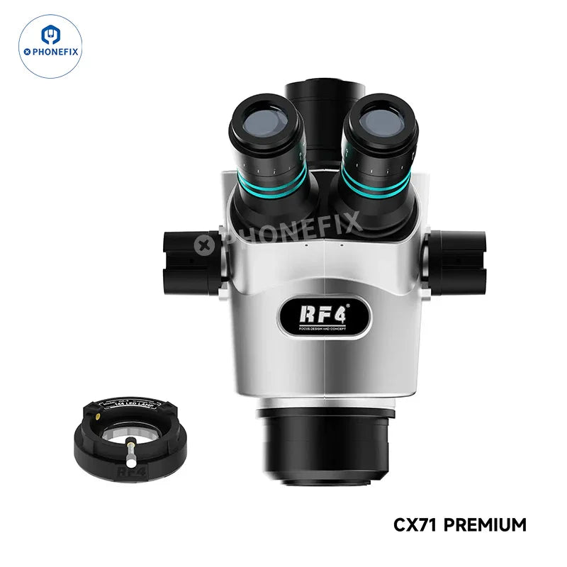 RF4 CX71 Premium 6.5X-65X Trinocular Stereo Microscope compatible with FO24 Stand and HDMI Camera for Mobile Phone Repair. RF4 CX71P Dual-Anti fatigue trinocular stereo microscope features WF10X/23 eyepieces, iris-coated objectives, and a 30° scientific tilt angle design, making it ideal for mobile phone motherboards BGA chips soldeirng and repair.
