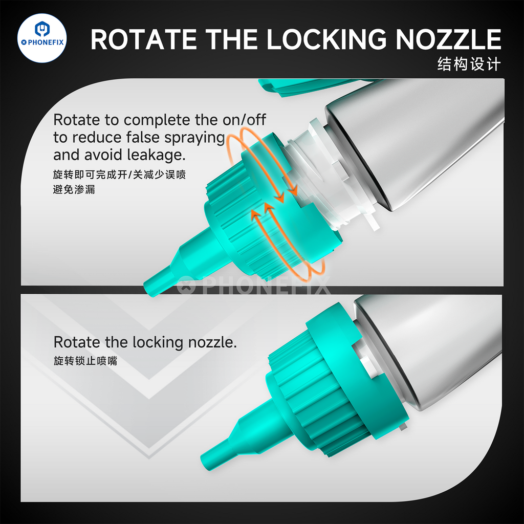 RF4 B20 multi-functional alcohol bottle features an innovative rotating nozzle, single-sided squeezing pressure, and precise liquid flow control, making it suitable for mobile phone repair, computer tablet repair, watch repair, motherboard repair, etc. It is refillable and compatible with various commonly used repair fluids.