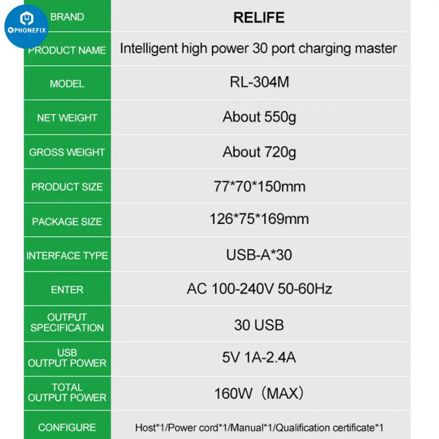 Specification: BRAND: RELIFE PRODUCT NAME: Intelligent high power 30 port charging master MODEL: RL-304M NET WEIGHT About: 550g GROSS WEIGHT About: 720g PRODUCT SIZE: 77*70*150mm PACKAGE SIZE: 126*75*169mm INTERFACE TYPE USB-A*30 ENTER AC: 100-240V50-60Hz OUTPUT SPECIFICATION: 30 USB OUTPUT POWER USB: 5V1A-2.4A TOTAL OUTPUT POWER: 160W(MAX)