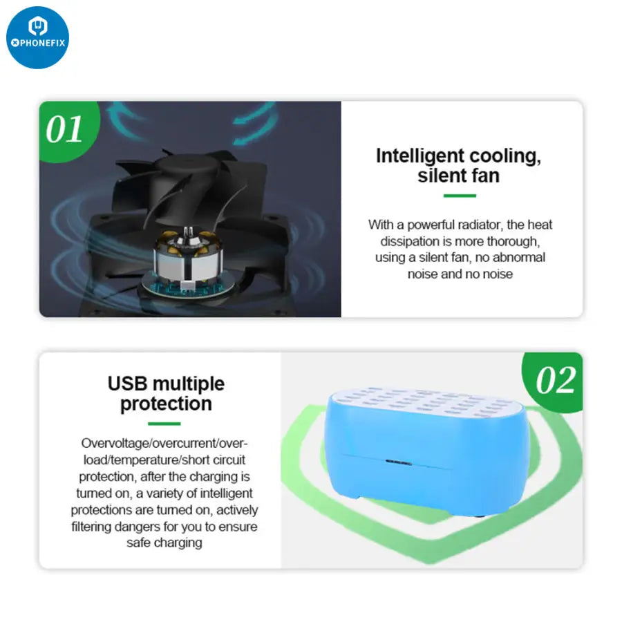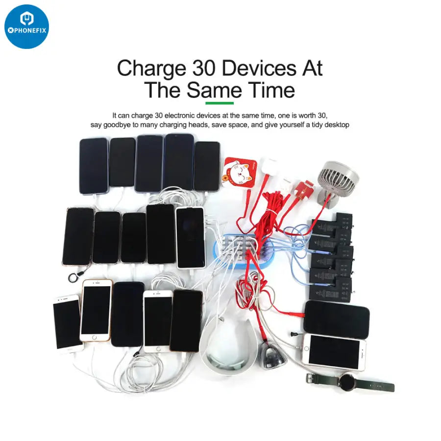 Features: 1. The total output 160W high-power charger provides strong expansion power, supports 30 ports to be used at the same time, and saves time and trouble for charging. 2. Built-in PWM power management chip, intelligently adjust the voltage and current output, safe charging without hurting the battery. 3. With a powerful radiator, the heat dissipation is more thorough, using a silent fan, no abnormal noise and no noise. 4. Small and not taking up space, compatible with all USB charging problems,Suitable for home/office.