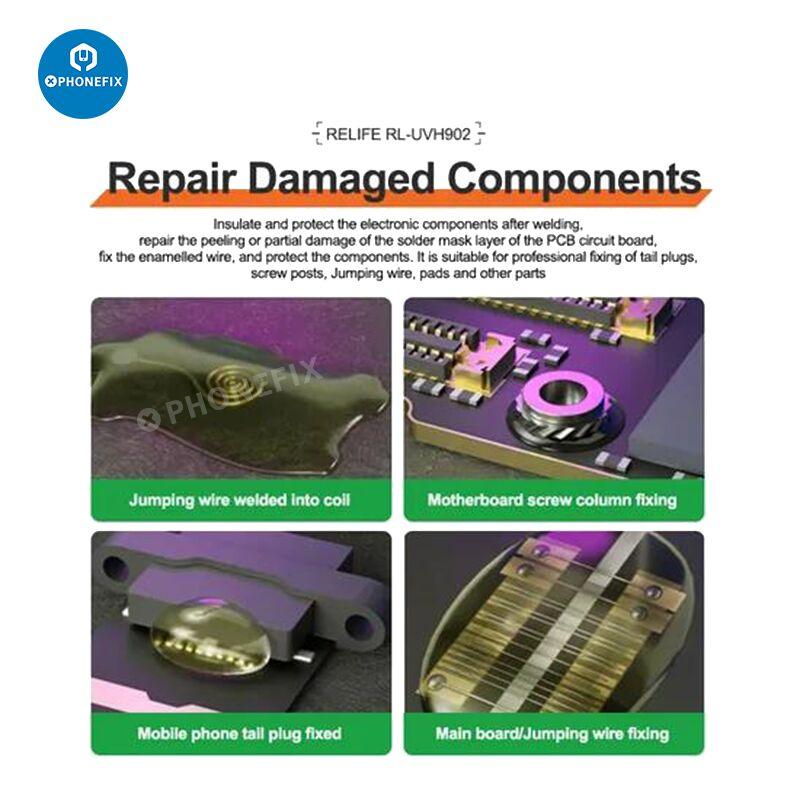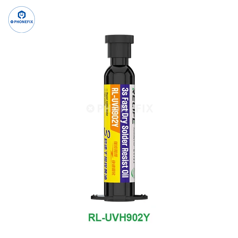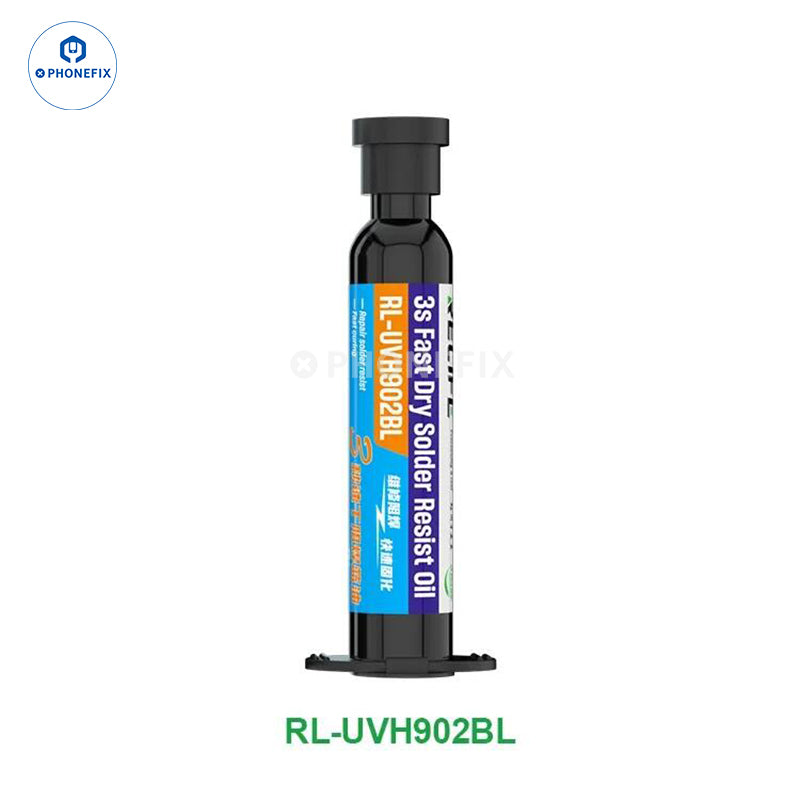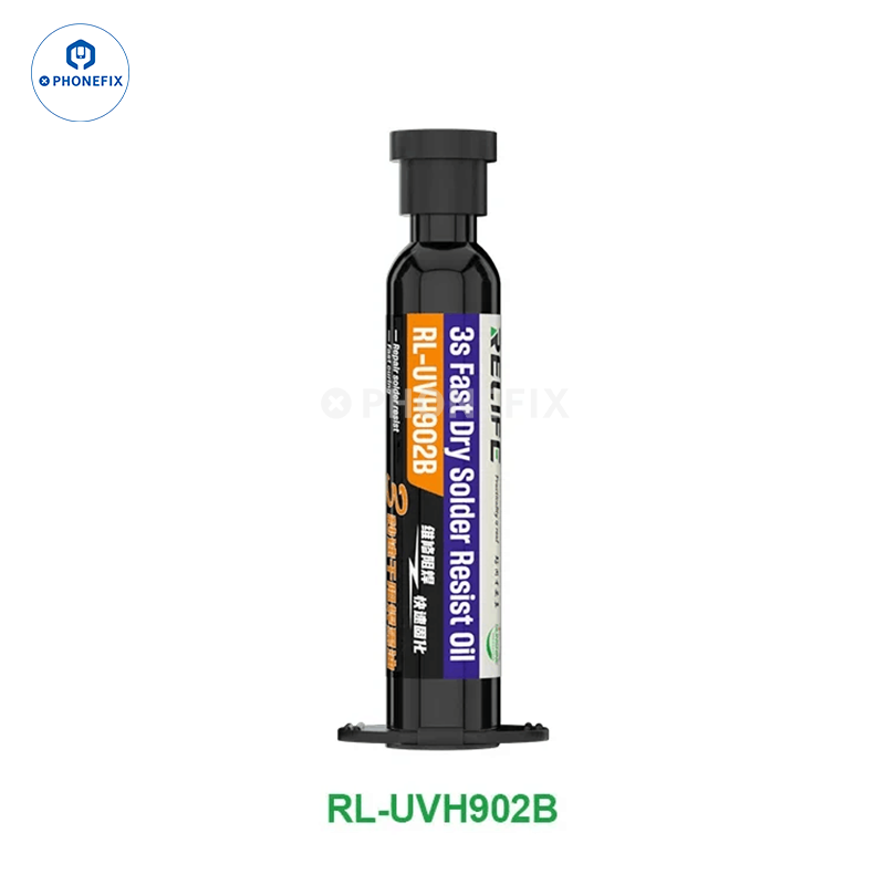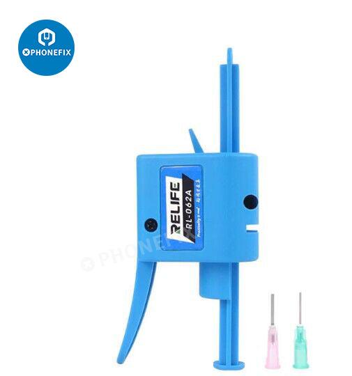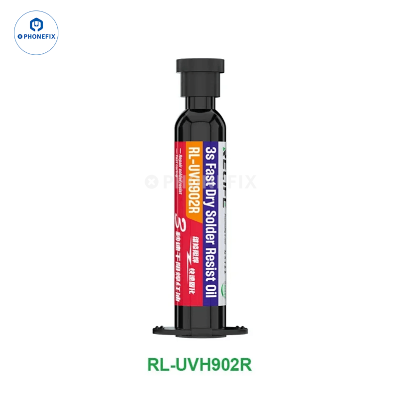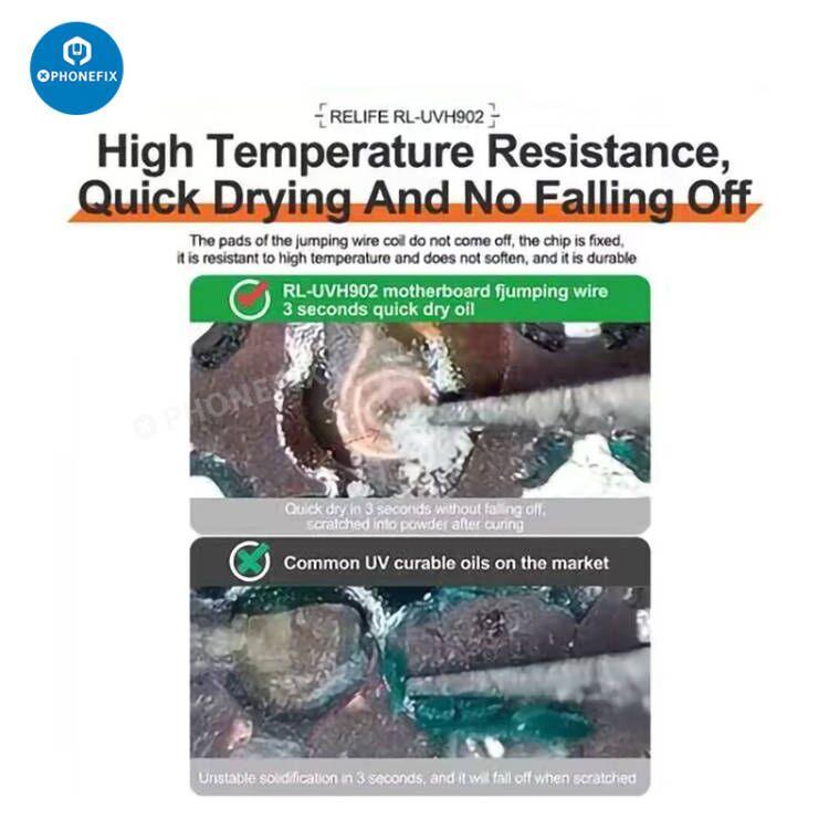 RELIFE RL-UVH902 Series motherboard jumping wire 3 seconds quick dry curing oil for mobile phone BGA repair. RELIFE RL-UVH902 Series 10cc UV Transparent curing soldering paste flux motherboard flying line quick dry oil with RL-062A manual glue gun for mobile phone motherboard BGA CPU welding repair.