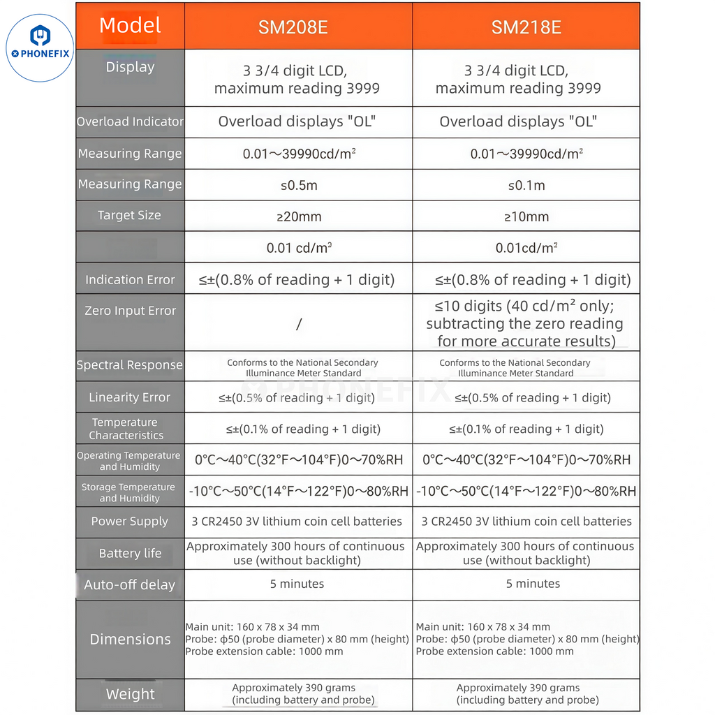 Xtester SM208E SM218E Screen High-precision Luminance Meter fluorescent transmission LCD lamp brightness tester for Mobile Phone and TV Screens. Silicon photocell detectors offer precise measurements over a wide measurement range (0.01cd/m² - 399,990cd/m²), with excellent stability. They feature a high-definition LCD display with backlight, value hold, and peak hold functions. Suitable for measuring the brightness of monitors, TV screens, laptops, mobile phones, and other electronic display devices.