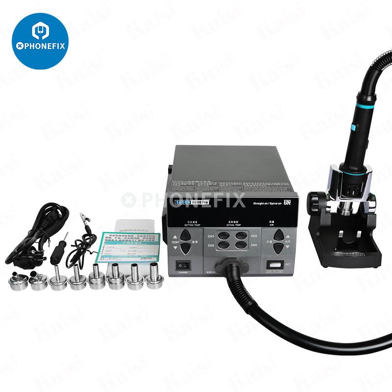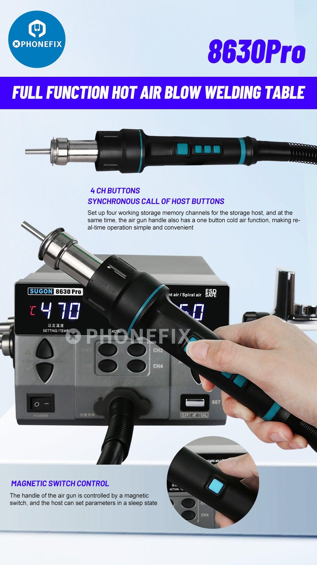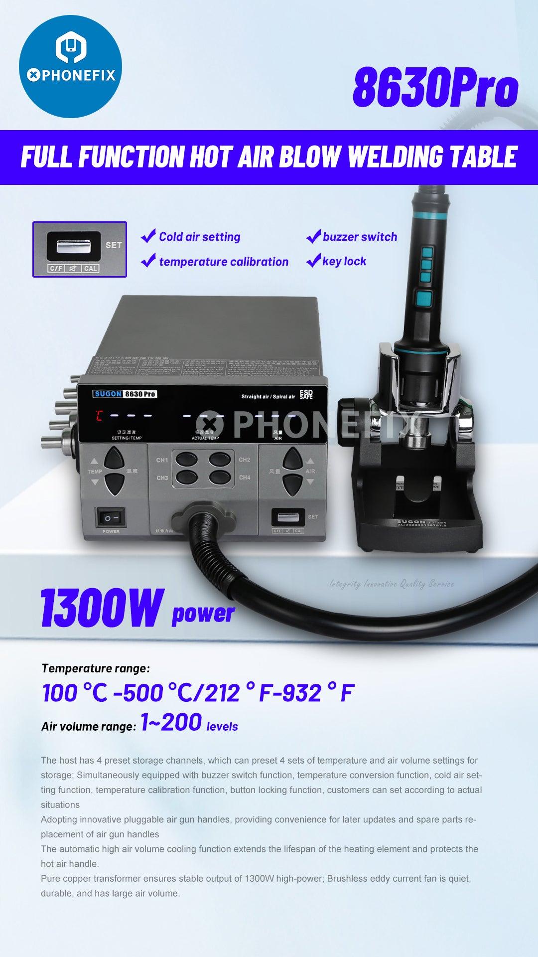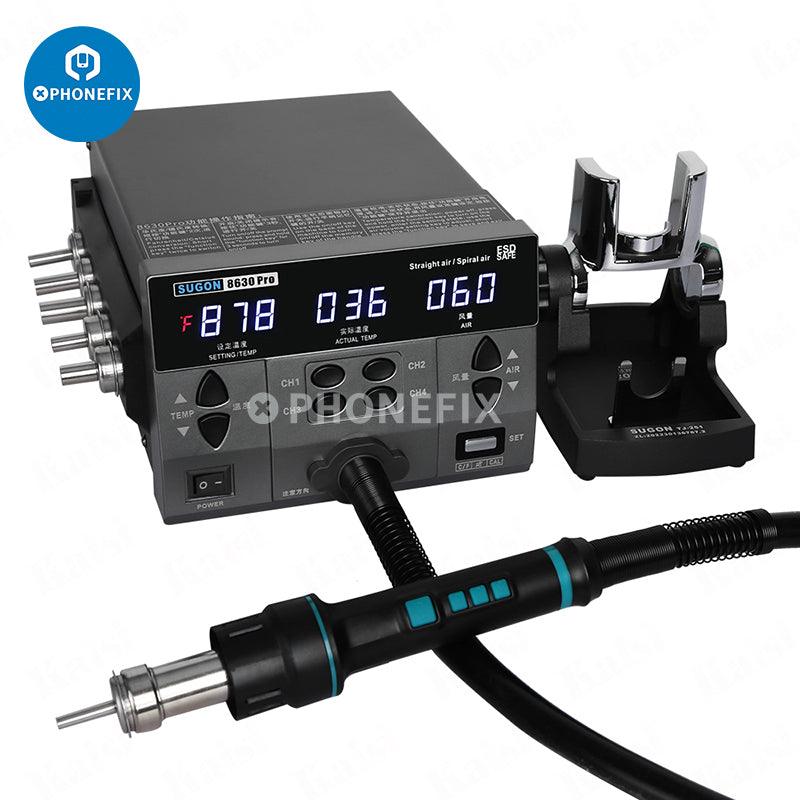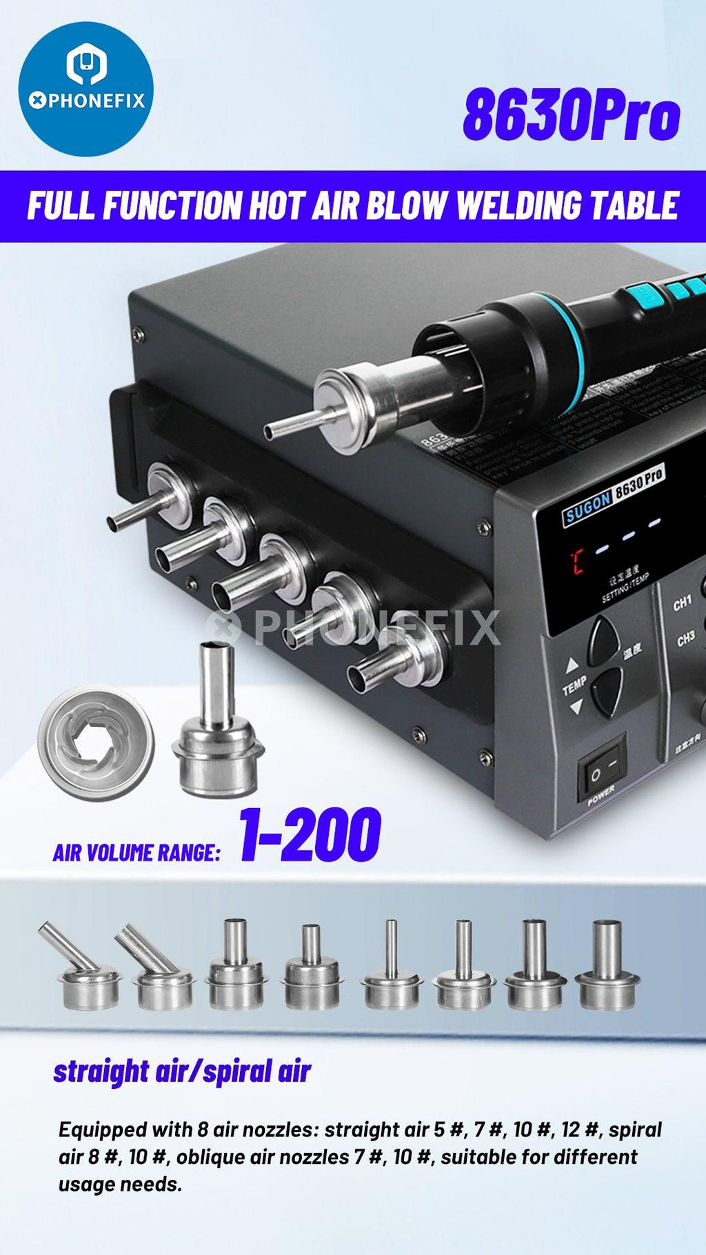 SUGON 8630Pro 1300W Hot Air Gun Digital Display BGA Rework Station With 8 Nozzles (5mm 7mm 10mm 12mm Straight nozzle). Sugon 8630 Pro Hot Air Rework Station Micro-soldering Tool For mobile phone electronic motherboard ECU IC welding desoldering repair.