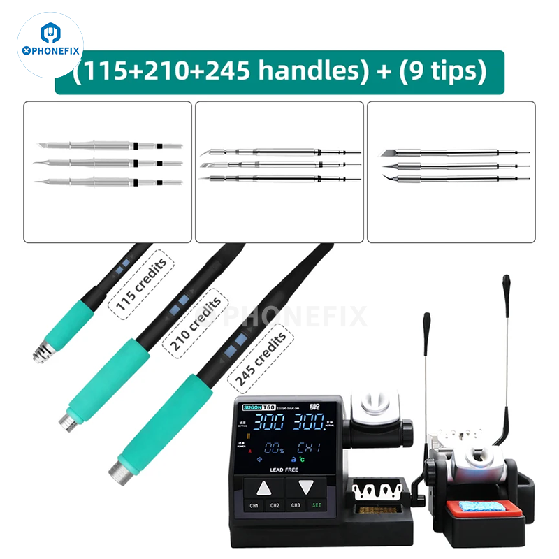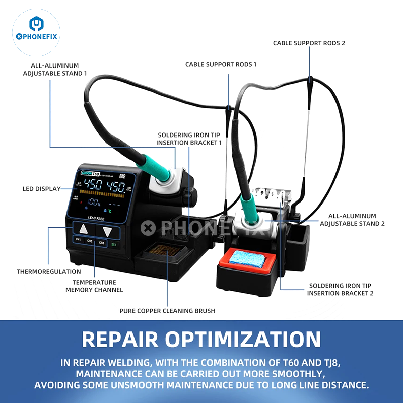 SUGON T60 Dual Soldering Station With TJ8 Extension Base Compatible With T210 T115 T245 Welding Handle And JBC C210 C115 C245 Soldering Tip. SUGON TJ8 soldering iron extension base works with Sugon T60 120W soldering rework station for motherboard BGA SMD chips soldering, desoldering, glue removing, tin welding, ect.