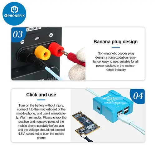 6.Turn on the battery without injury, connect it to the motherboard of the mobile phone, and use it immediately. Warm reminder: Please check the positive and negative poles of the mobile phone carefully before use, and the voltage should not exceed 4.8V, so as not to burn the mobile phone.