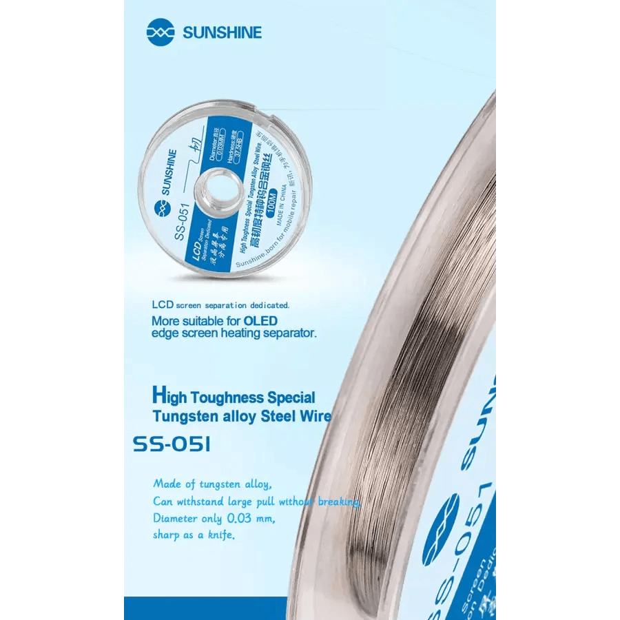 Sunshine SS-051 LCD Screen Separation Wire Ultrafine 0.03MM Cutting Steel Wirehigh toughness spacial tungsten alloy steel wire. Sunshine SS-051 LCD Screen Separation Wire Ultrafine 0.03MM Cutting Steel Wire.