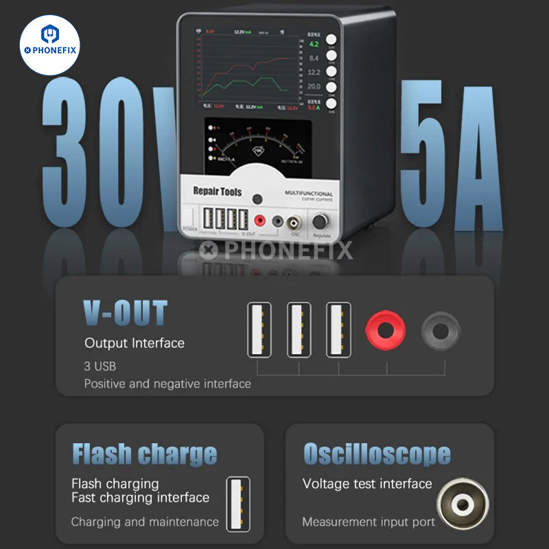 1. 30V 5A curved DC power supply, burning tool, three-channel storage, current and voltage hyperbola, constant voltage and current limit, one-click output.