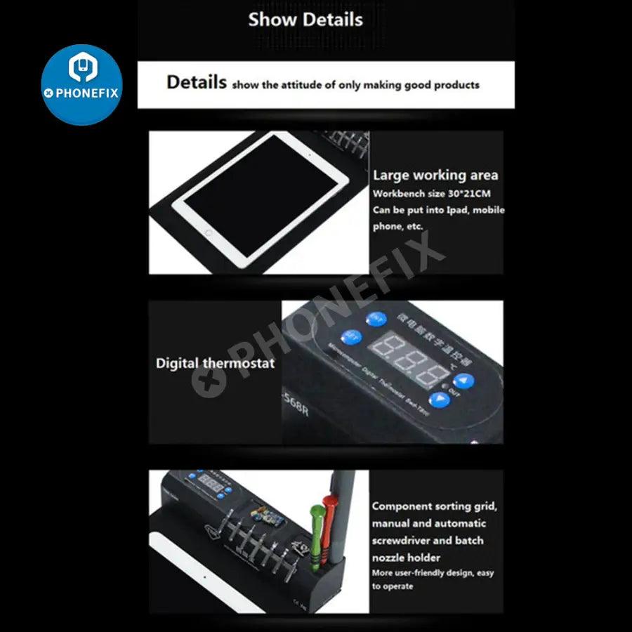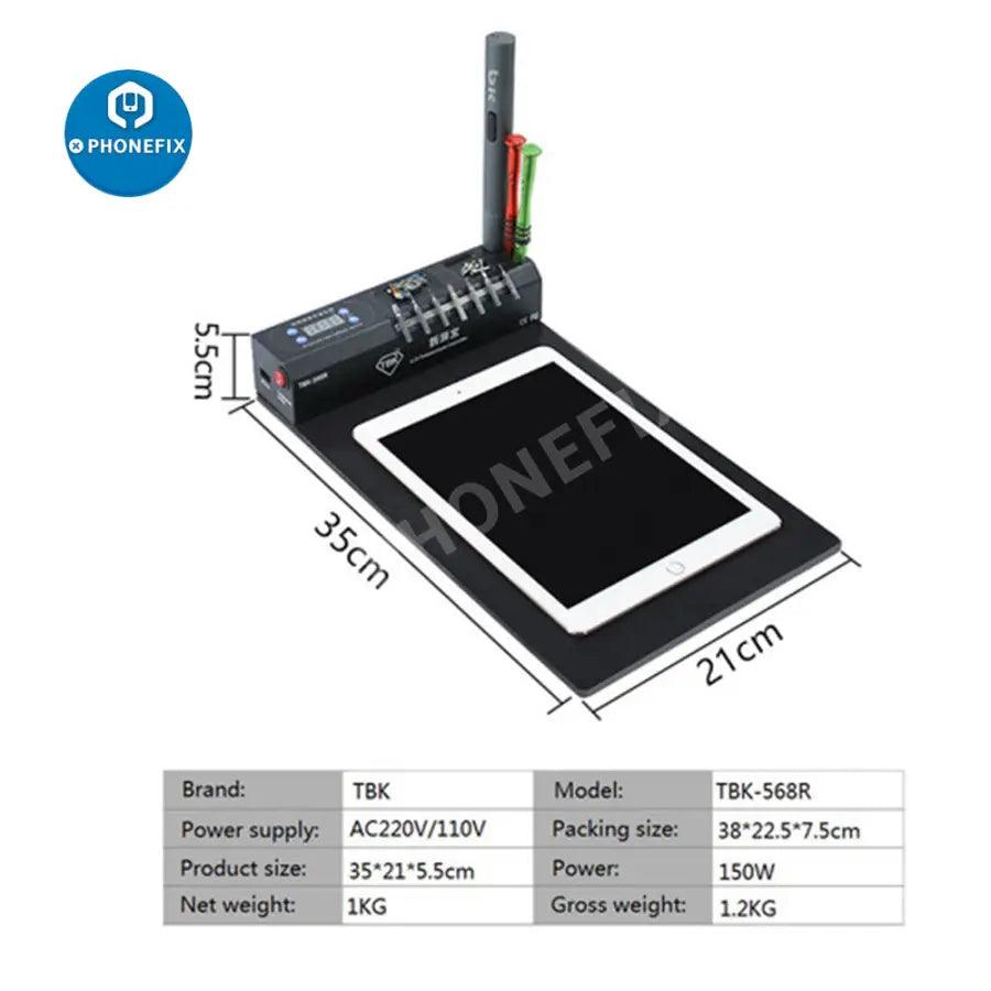 TBK-568R TBK-568A LCD Screen Disassembly Preheating Platform for mobile phone/iPad screen separation repair. TBK 568A 16-inch LCD screen removal super fast heating tool with high-temperature resistant silicone pad for mobile phone iPad repair. TBK 568R screen heating separator with screwdriver holder and USB charging for iPhone iPad.
