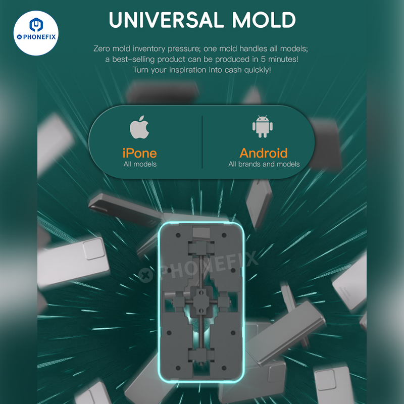 1. Universal Mold System: Adjustable molds adapt to all iPhone and Android phone models, eliminating the hassle of stocking.