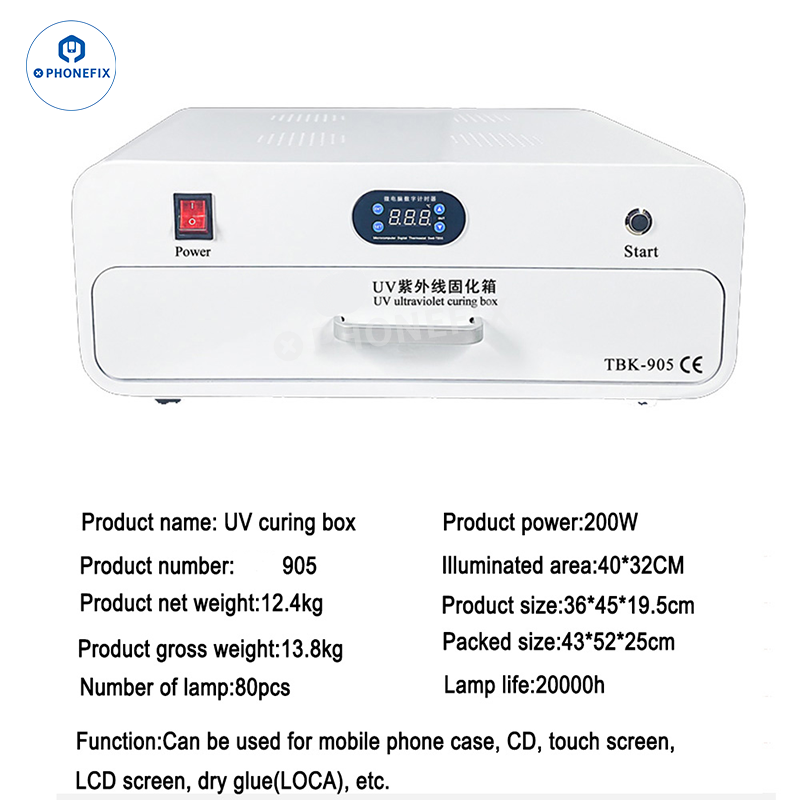 1. TBK 905A UV curing box has 200W high power, a double cooling system, one-key start work, and can place multiple mobile phones for curing at the same time.