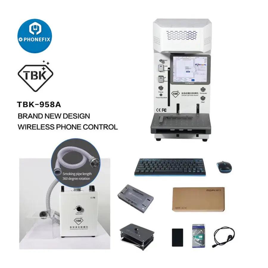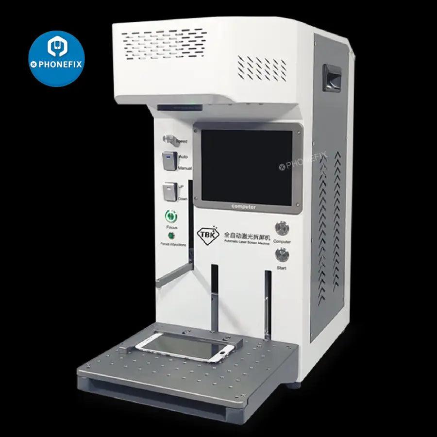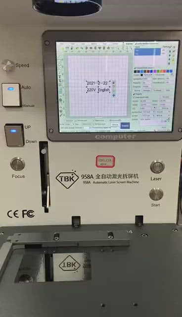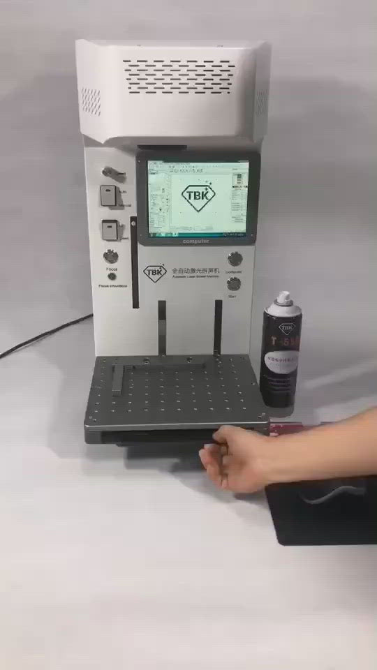 TBK 958A Laser Machine for Phone back glass removing, front frame separating, logo laser engraving and marking; Intelligent auto focus TBK 958A can remove the back glass cover for iPhone 8 to iPhone 12 Pro Max. TBK-958A laser engraving separating machine with built-in computer for Mobile Phone Back Glass Cover remover and LCD Frame Repair, DIY logo marking.