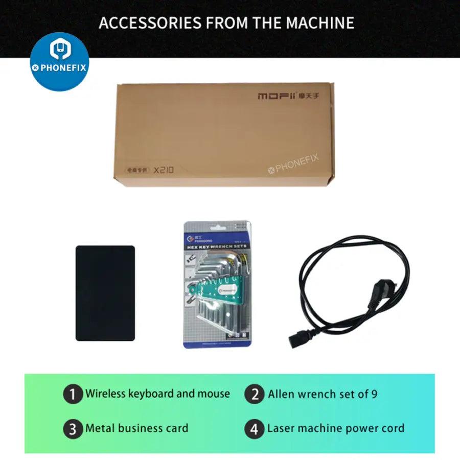 Features: 1. Removing the back glass cover for iPhone 8-12 Pro Max, 2. Removing front frame for Samsung, Huawei, iPhone 8, 8+, X, XR, XS, XS max, 360, Jin li, LG, Mei tu, Mei zu, NOKIA, OPPO, VIVO, Xiaomi, Yi jia, etc. 3. Engraving on any kind of metal or plastic. 4. Buli-in computer and keyboard, auto focus. 5. One-click engraving 6. High Resolution Embedded Computer 7. Equipment and spare parts for display repair