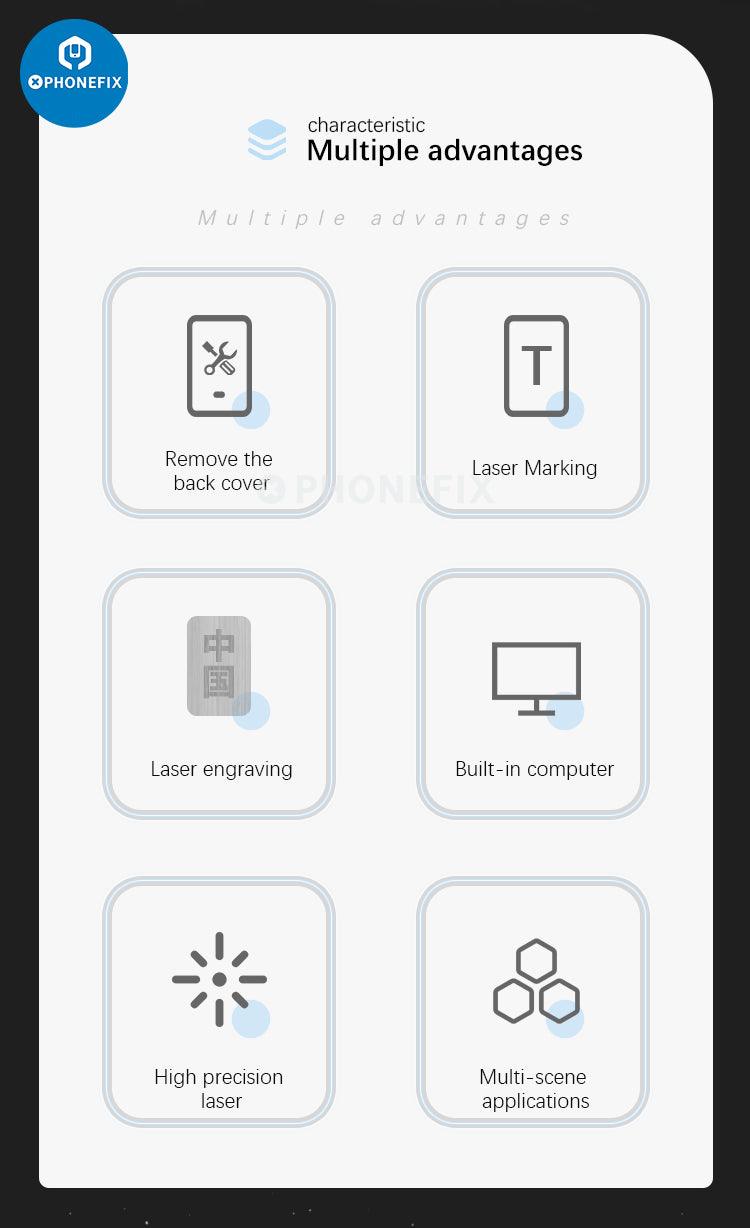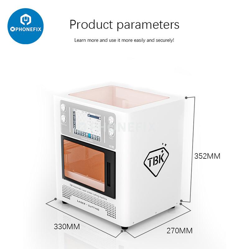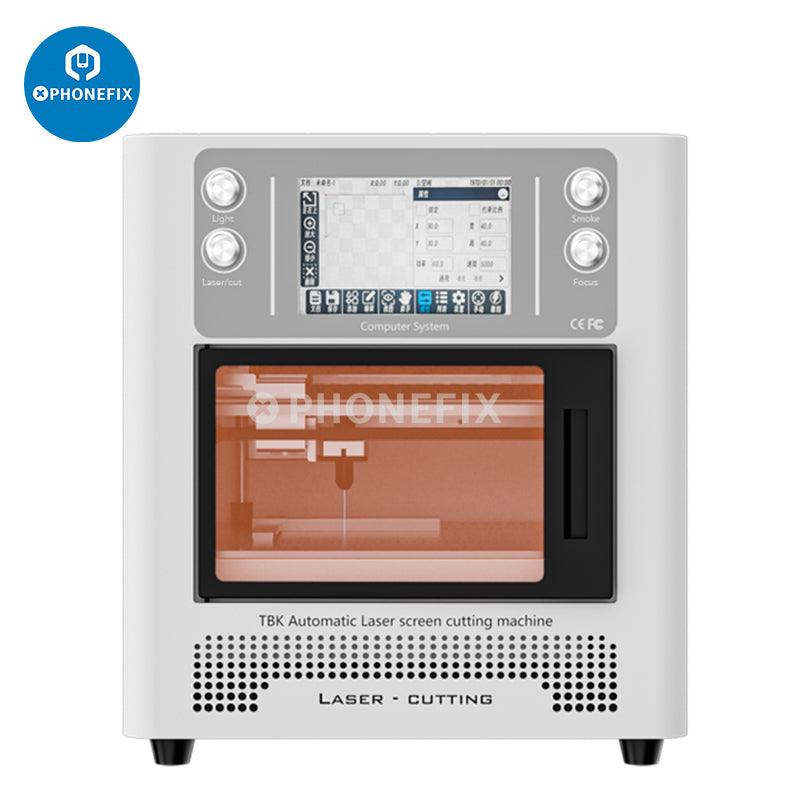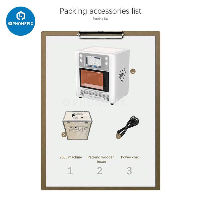 TBK-958L automatic blue-ray laser machine for iPhone back cover glass removal and screen frame separating disassembly, DIY engraving Logo letters, and it can cut soft film, wood, rubber pad, sponge, etc. TBK-958L professional 10W laser machine for iPhone 8-14 Pro Max and mobile phones.