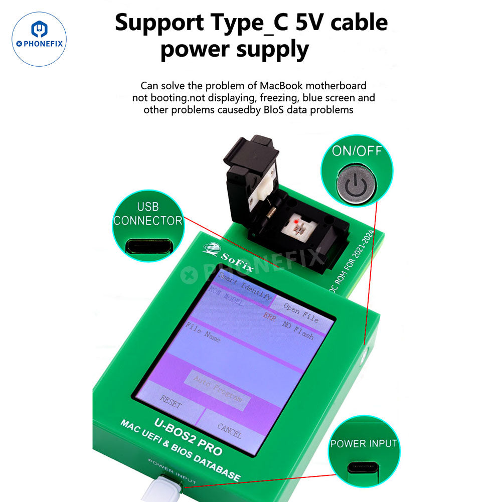 SoFix U-BOS2 PRO MAC UEFI and BIOS DATABASE Programmer has a complete and clean ROM data database for MacBook models from 2008 to 2024. U-BOS2 PRO programmer is a professional MacBook repair tool that can remove EFI locks, firmware locks, PIN code locks, MDM remote locks, and Google locks from 2008-2020 MacBooks. It can also write original data to the ROM of T2, M1, M2, M3, or M4 chipsets from 2018-2024 models. Can resolve issues such as MacBook motherboard BIOS data errors, etc. UFIX U-BOS2 Data Assistant for MacBook UEFI & BIOS Database Read Write Backup Repair, suitable for all MAC from 2008 to 2020, including iMac, Mac Mini/ MacBook Pro/ MacBook Air.