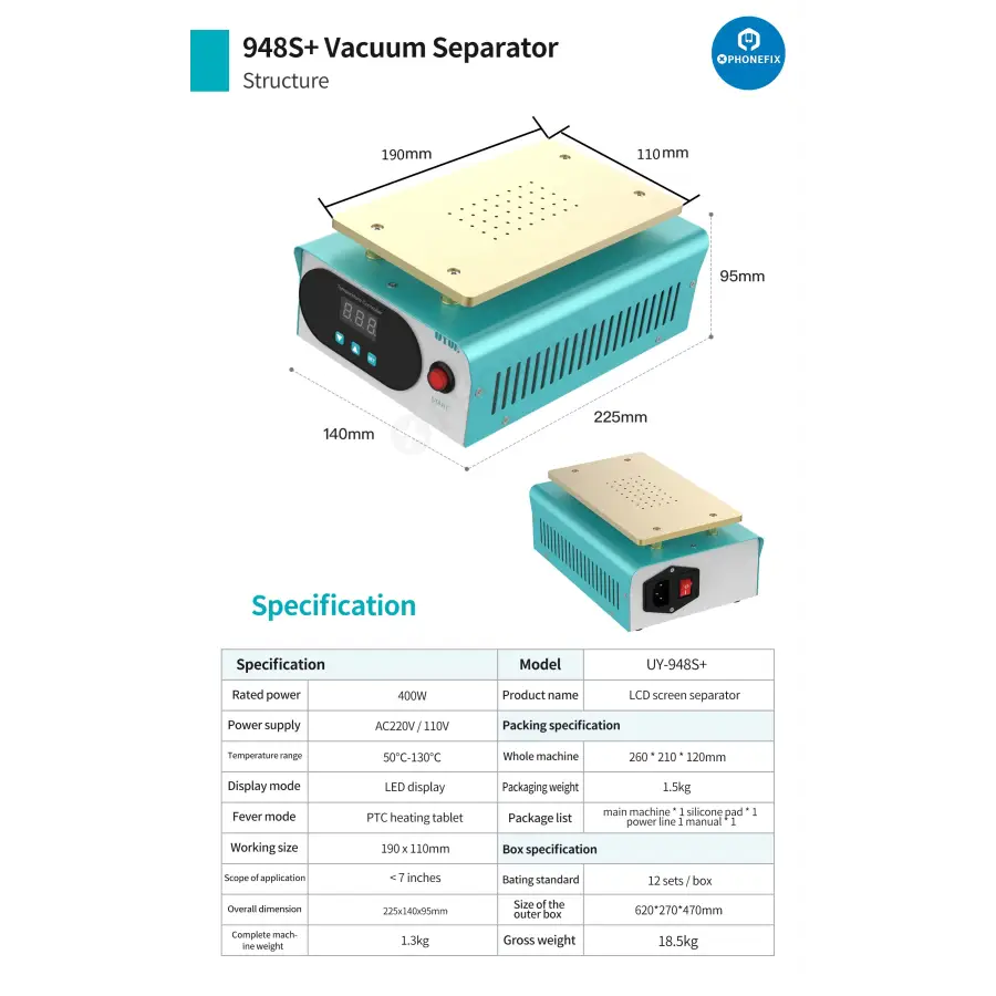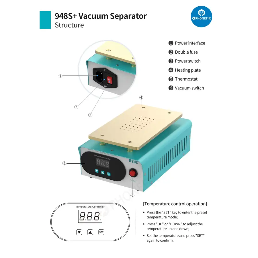 Uyue 948T LCD touch screen separator for preheating separating screen. This LCD Separator with built-in vacuum pump, is suitable for mobile phone iPad tablet screen under 7 inches.