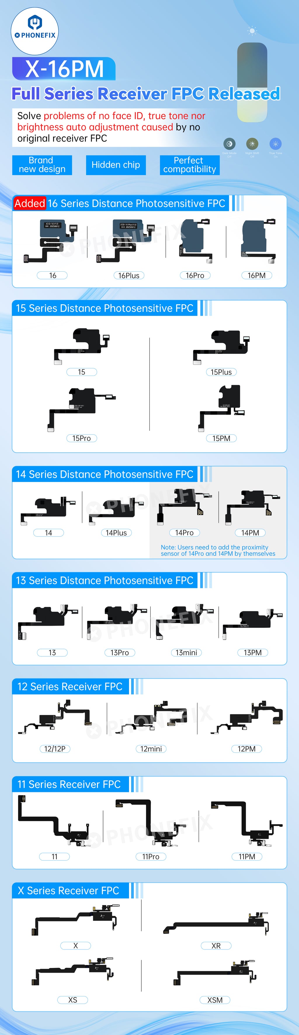 1. Support to repair iPhone X-16 Pro Max face ID truetone problem caused by receiver FPC Failure, and not require original receiver FPC.