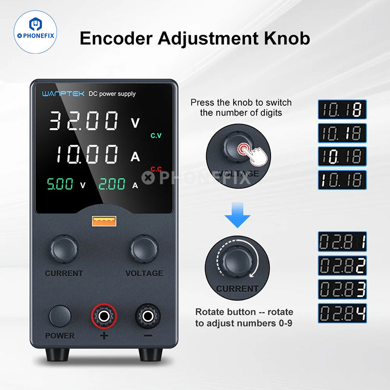 Wanptek GA305H GA3010H GA605H GA1203H GA1602H Power Supply 0-120V 0-10A Adjustable DC Voltage Regulator With USB Display for mobile phone and computer repair, battery charging, product aging, plating, production line testing, research and teaching, ect. Wanptek GA series DC power supply has USB fast charging, short circuit protection, overload protection and other functions.
