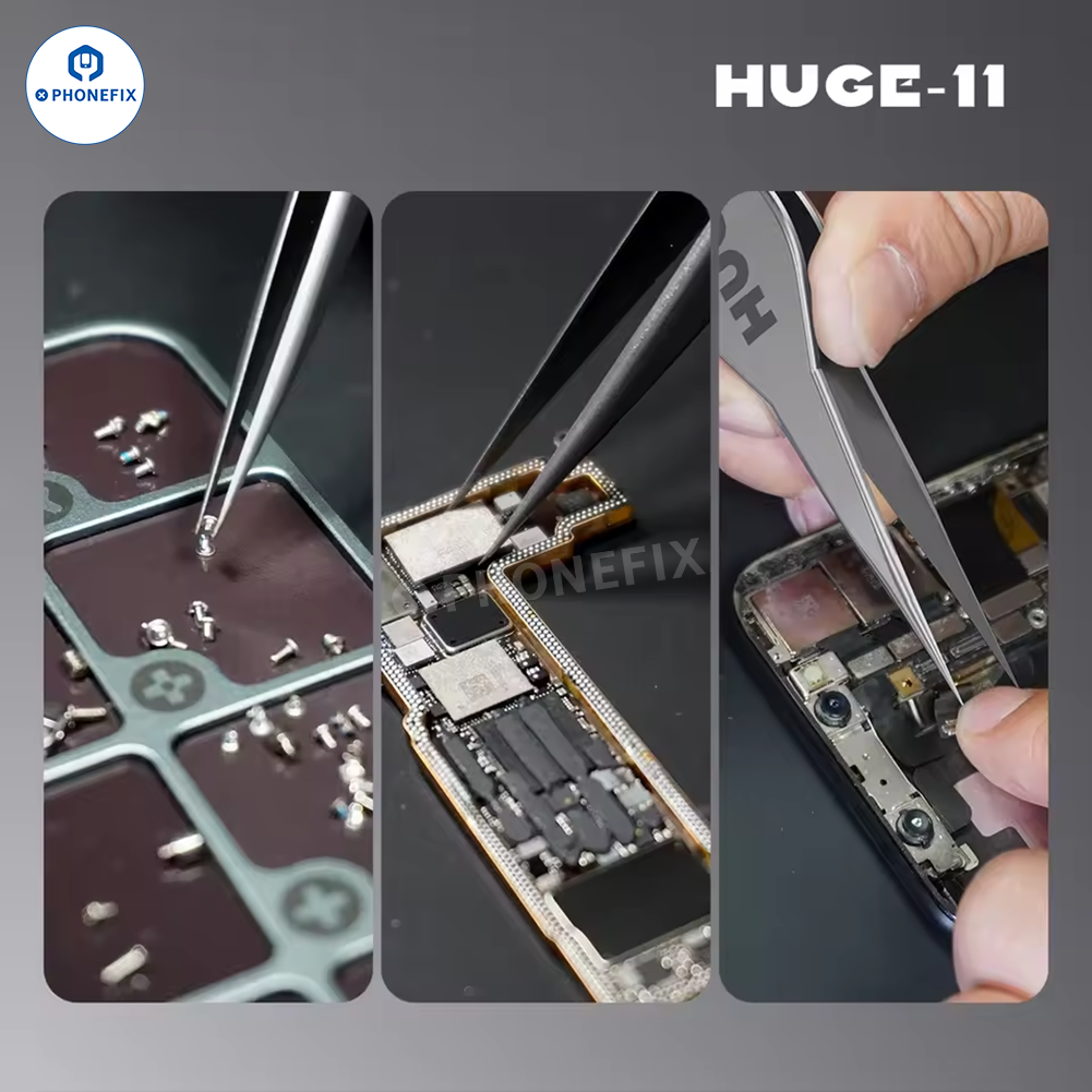 1. Mechanic Huge-11 tweezers features a widened handle design that makes the tweezers fit the fingers better, providing a more comfortable grip and easier handling during repair processes.