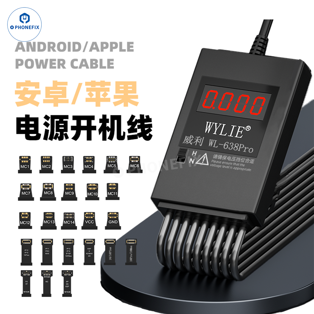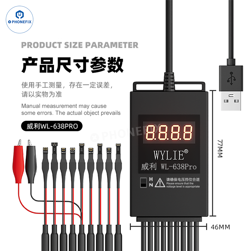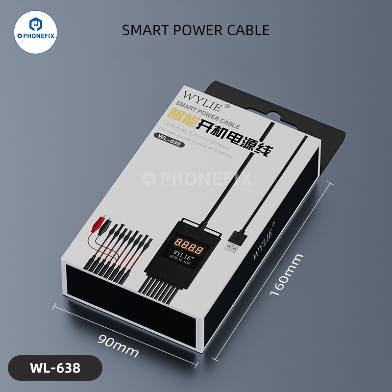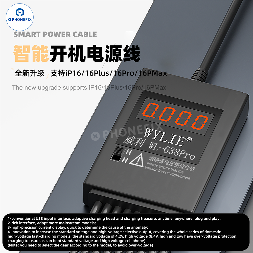 WYLIE WL-638PRO Smart Power Cable upgraded to support iPhone 16/16 Plus/16 Pro/16 Pro Max, with standard voltage & high voltage optional output. 2024 WYLIE WL-638 Pro power cable for Android Phones/iOS iPhone 6/7/8/X/XS/11/12/13/14/15/16 Pro Max repair. It comes with a USB input interface, which enhances its functionality and usability. Its overcharge protection creates a safe and stable motherboard and battery repair.