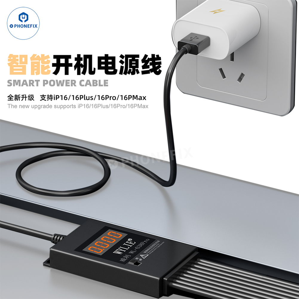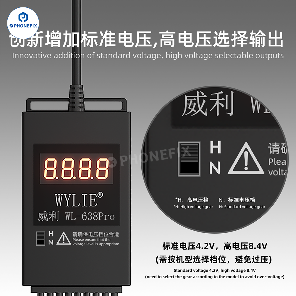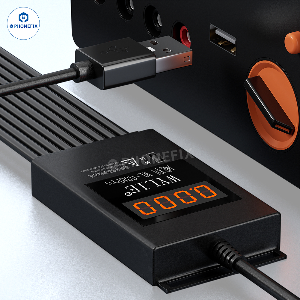 WYLIE WL-638PRO Smart Power Cable upgraded to support iPhone 16/16 Plus/16 Pro/16 Pro Max, with standard voltage & high voltage optional output. 2024 WYLIE WL-638 Pro power cable for Android Phones/iOS iPhone 6/7/8/X/XS/11/12/13/14/15/16 Pro Max repair. It comes with a USB input interface, which enhances its functionality and usability. Its overcharge protection creates a safe and stable motherboard and battery repair.