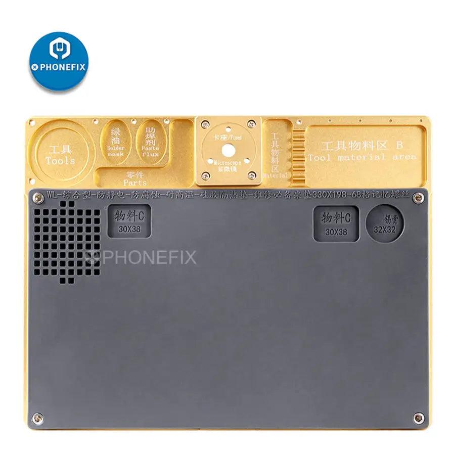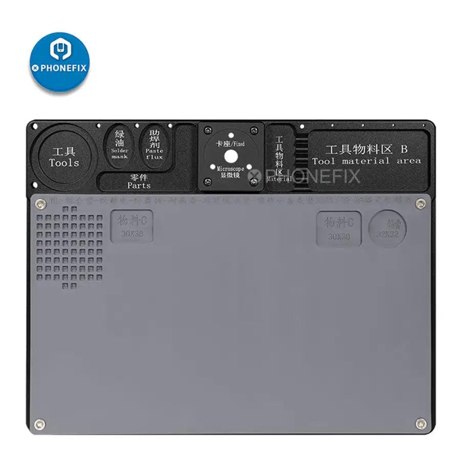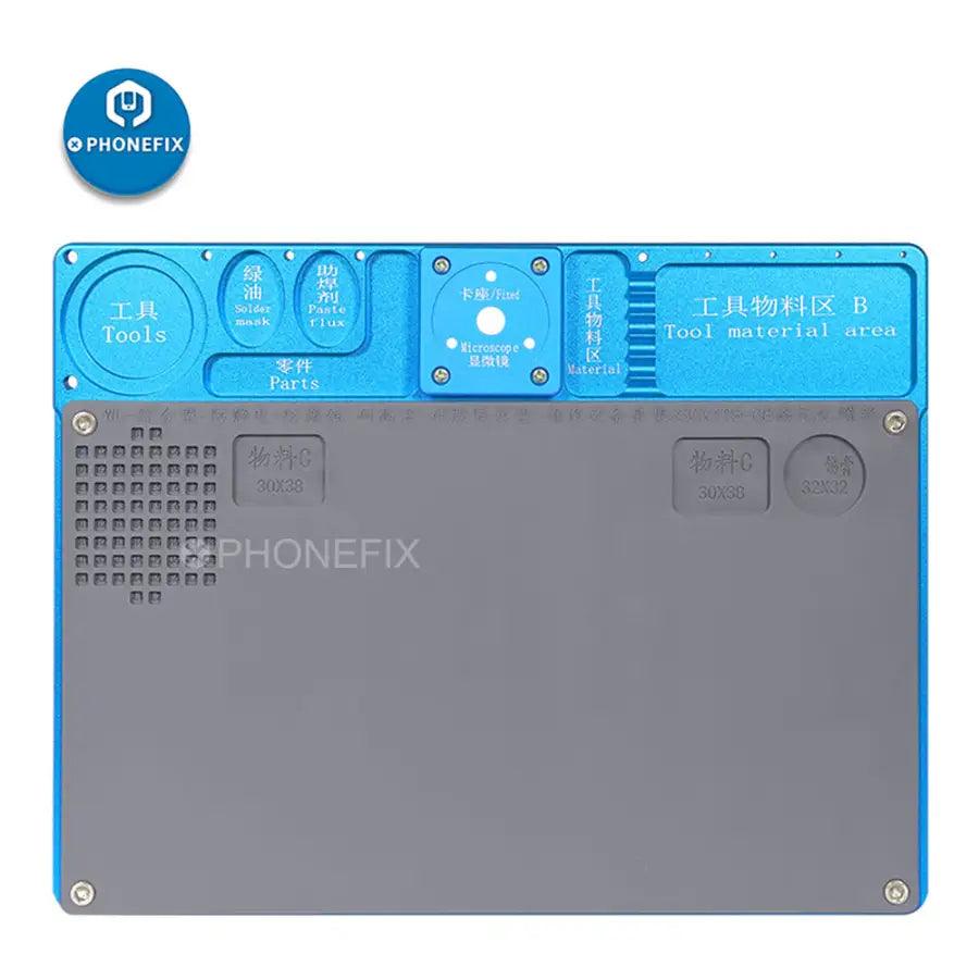 WL multifuctional integrated aluminum alloy microscope maintenance platform with heat insulation silicone insulation pad for cell phone logic board repair, WL heat-resistant phone soldering repair mat platform for mobile phone soldering maintenance.
