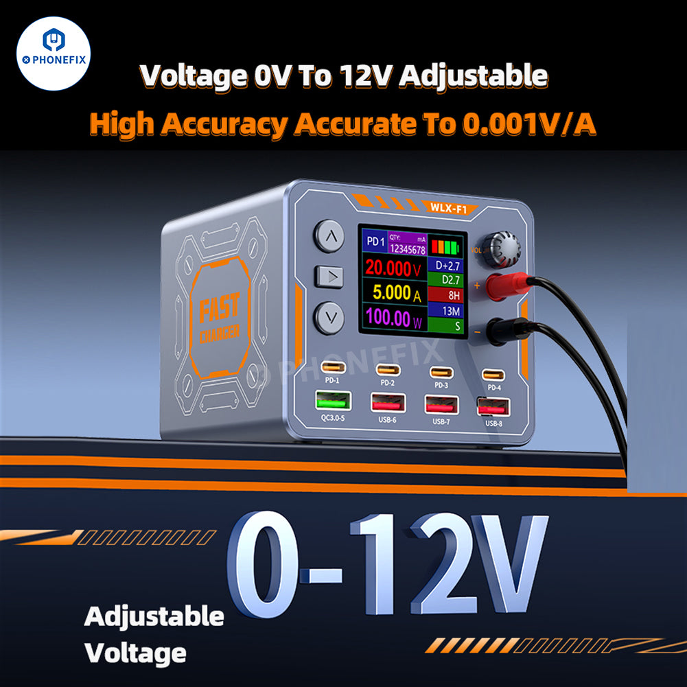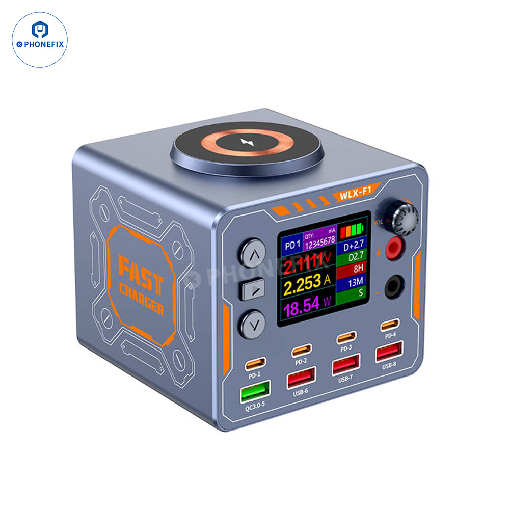 WLX-F1 140W intelligent wireless charging station with USB PD QC3.0 8 ports for mobile phone laptop repair. Large color display, voltage adjustable, multiple charging ports, 15W wireless fast charging. Accurate voltage detection and regulation, with real-time display, can simultaneously provide efficient, fast and safe charging for iPhone, laptops, mobile phones, tablets, headphones and other devices.