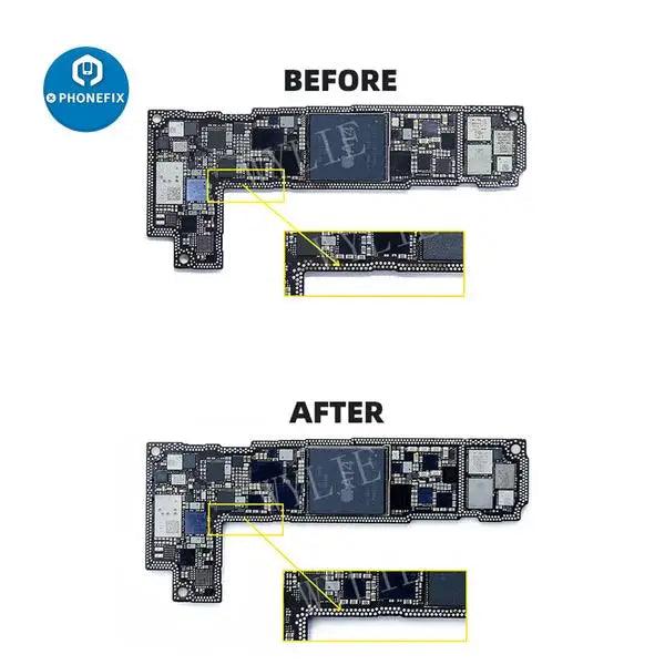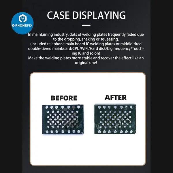 Rip off the covering layer.And repair your welding plates right now! In maintaining industry, dots of welding plates frequently faded due to the dropping, shaking or squeezing. (included telephone main board IC welding plates or middle-tired double-tiered Motherboard/CPU/WIFI/Hard disk/big frequency/Touching IC and so on) Make the welding plates more stable and recover the effect like an original one!