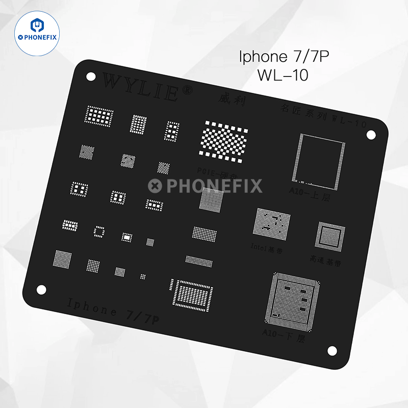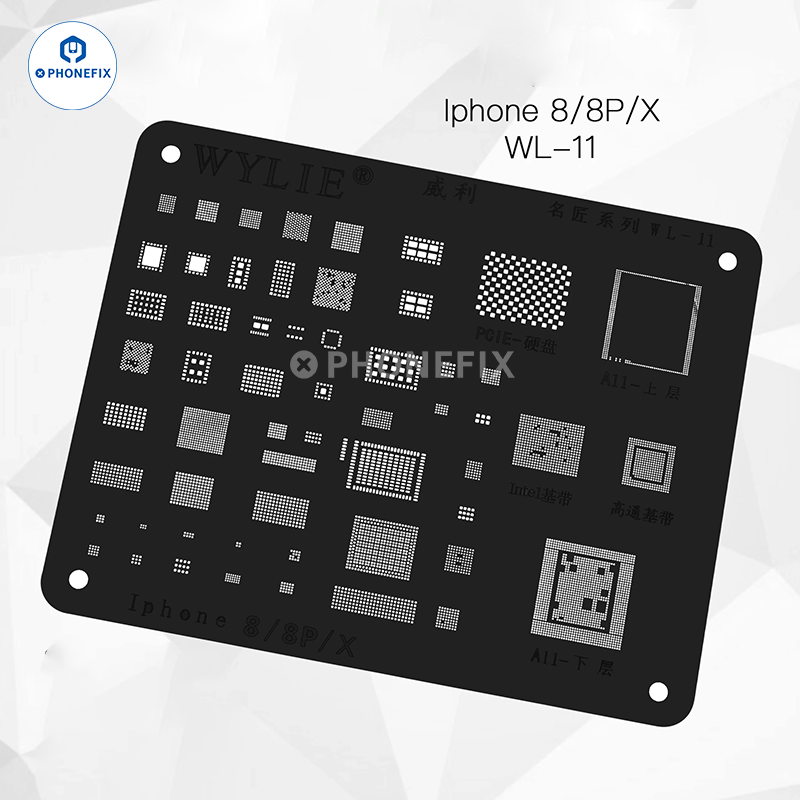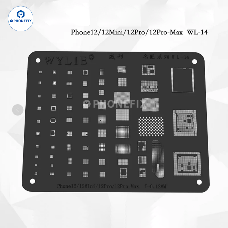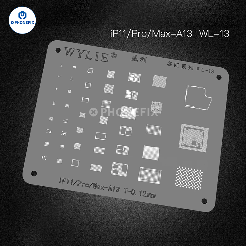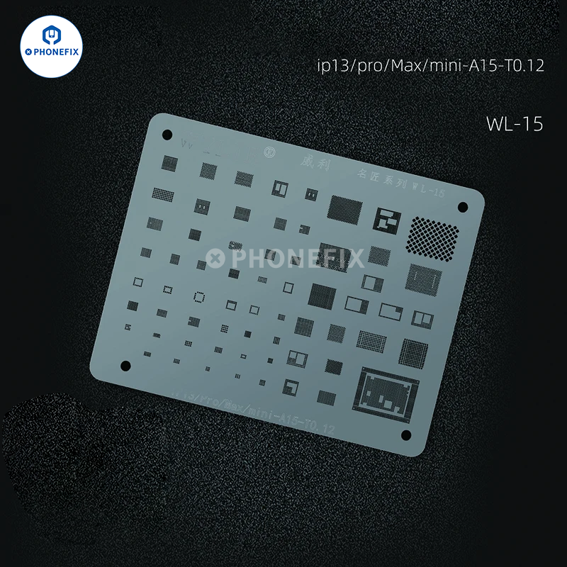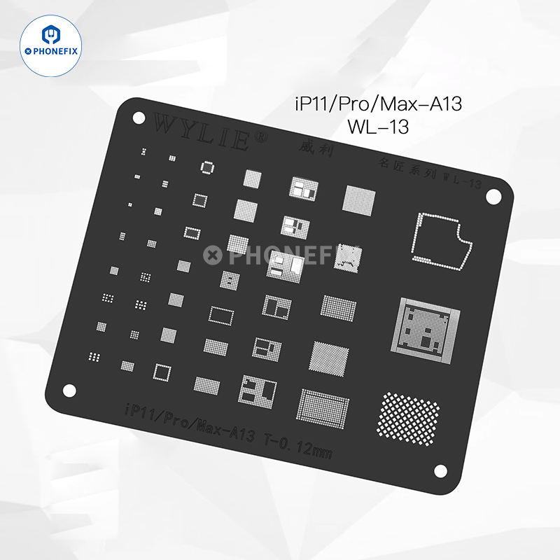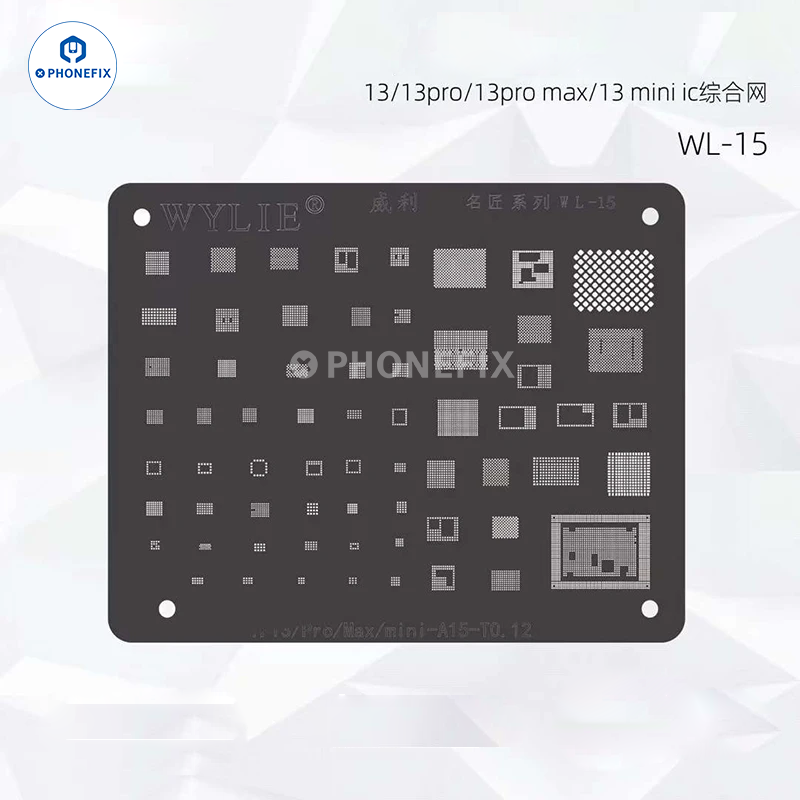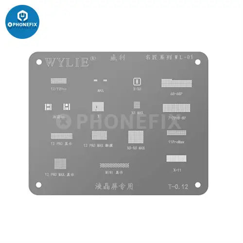 WYLIE WL-01 to WL-15 BGA reballing stencil for iPhone CD display screen IC soldering repair. WYLIE reballing stencil for iPhone LCD screen IC dot matrix face ID IC soldering repair. High quality square hole iPhone display IC reballing stencil. allows you to swap out photos, videos, and play games without having to take it off.