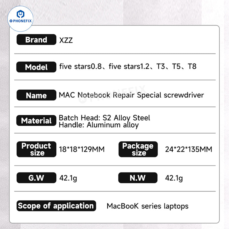 XZZ Mac Precision Screwdriver set adopts high hardness S2 alloy steel bits for MacBook Laptop disassembly assembly and repair. XZZ MacBook Special Screwdriver Set with strong magnetic screwdriver bits (Pentalobe 0.8 1.2, Phillips 3.0 and Hexagonal T3 T5 T8 bits) easily absorbs small screws, anti-slip thread, exquisite workmanship, improve the efficiency of disassembly, assembly and repair of MacBook computers.